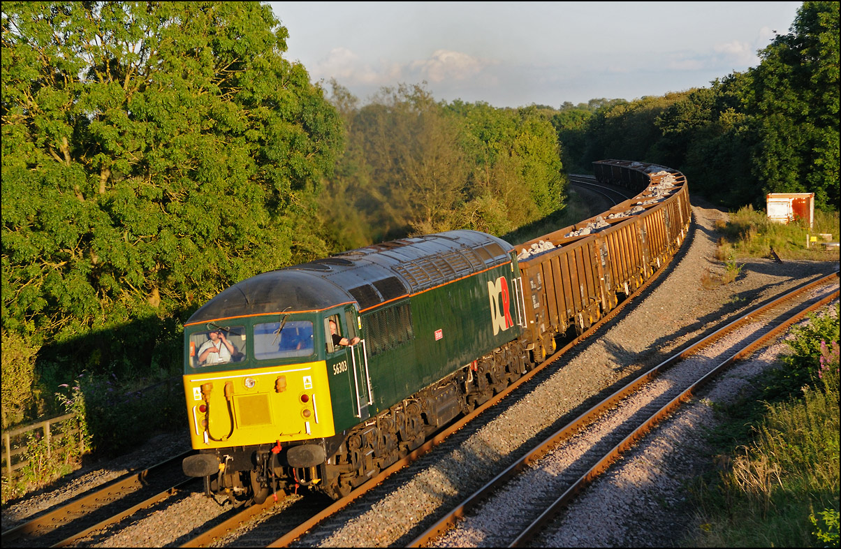 This train is 1F94, Chiltern Trains' 18.07 London Marylebone to Kidderminster, pictured with 67014 leading as it rounds the curve from Hatton station to Hatton North Junction. This was running a few minutes late which, along with some sensible regulation from signallers, had allowed 56302 on a heavy train of slag bound for Rotherham to have a clear run at Hatton Bank. In recent weeks some of the Chiltern sets have been running in both the up and down directions with the locomotive leading because of some problem or other with the operation of the coach doors when the DVT is leading. This has meant that the sets have had to be turned using the Greenford Loop at the London end and on the Hatton Triangle after visiting Birmingham.