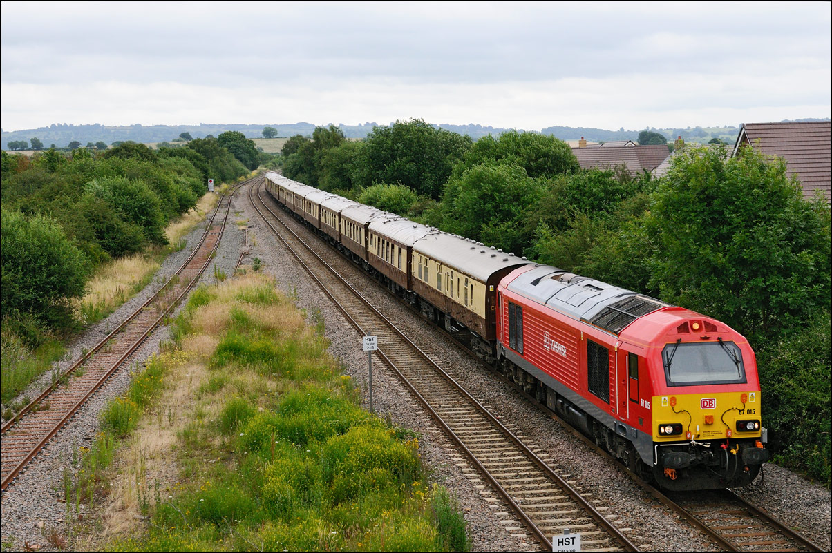 Two special trains were run to Worcester Shrub Hill on Saturday 9 July 2015. The first was 1Z80, the 09.59 from London Victoria, which was formed of the VSOE stock top and tailed by DBS's 67015 and 67018; a class relatively unusual along the North Cotswold Line these days. The light during the morning was poor so with no prospect of any sun I went to the road bridge adjacent to Honeybourne station which gives a reasonably wide view from the north side so that the stock can be seen. The train ran close to right time during most of the journey but was a few minutes early when it appeared in the distance running alongside the Long Marston branch which, incidentally, looks ready for a visit by the weedkiller. As usual these days I didn't see a single posting about this train from anyone who photographed it further south nor were there any about the second train from Southend Victoria but as this was operated by WCRC I didn't bother to wait for it, the thought of their sludge-like locomotive colour scheme not exactly filling me with joy on such a dull day.