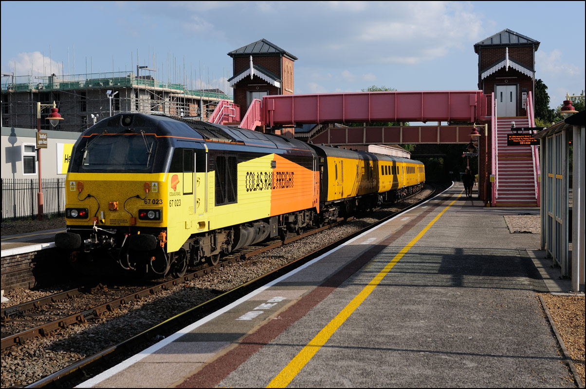 The sun stayed out just long enough Tuesday 22 May 2018 to take a photograph of 67023 with 1Q48 standing in platform 1 at Stratford-upon-Avon station. The distracting background of scaffolding shows a tiny part of a huge sink estate of the future undergoing construction on the site of the cattle market. The consensus of local opinion of which I am aware suggests that within a few years this part of the town will be very much a no-go area after dark. Well done, Stratford DC...