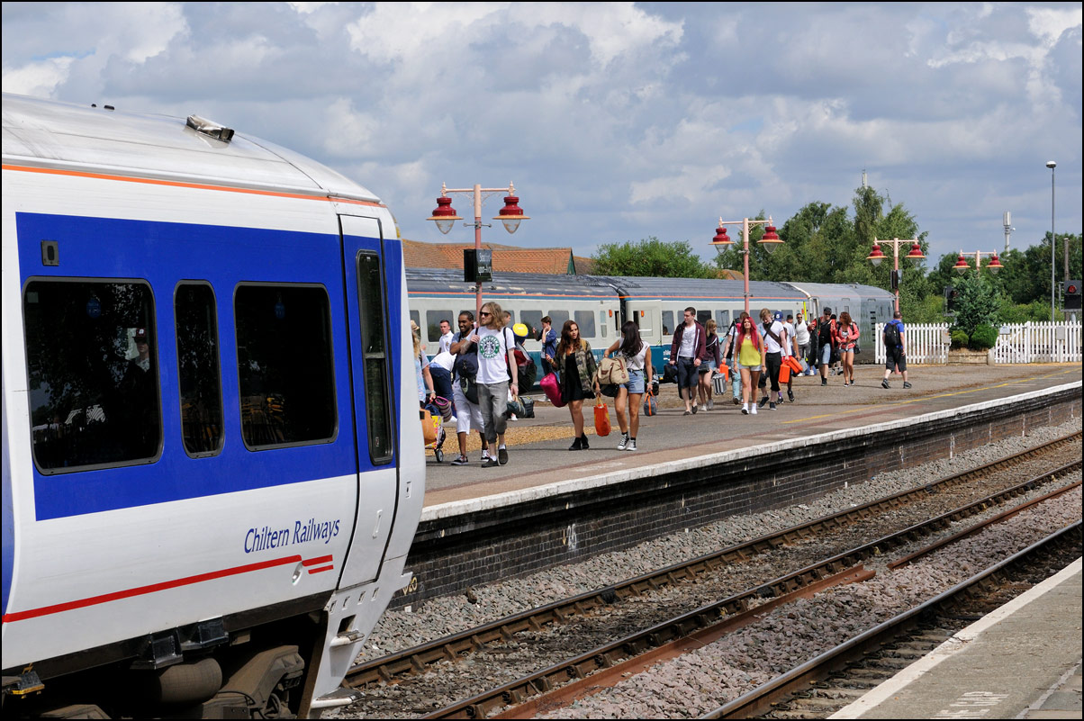 The annual Global Gathering music festival took place at Long Marston airfield over the weekend of 26-28 July 2013. Chiltern Railways ran several additional services from London Marylebone to Stratford-upon-Avon and the most interesting of these was 1Z18, the 09.18 from London formed of 67023 hauling the blue & grey slam door stock. The scheduled arrival time at Stratford was 10.55 and the train should have run into platform 2 but the preceding train formed of a Chiltern class 165 had gone into there some fifteen minutes earlier and wasn't due to leave as ECS until 11.00. There was little chance of 1Z18 going into platform 1 as this would be needed by the Stourbridge Junction trains so the only option was P3. This was initially a bit disappointing but I changed my mind when I thought about it; I didn't have a picture of a locomotive-hauled train going into this one. I did take a picture of 37418 standing there but this was way back in March 1994. All in all I was quite happy with this image of 67023 with it's full load of some 600 passengers arriving at Stratford; more so than the one taken of the return, 1Z62, when it passed Stratford Parkway with DVT 82305 leading in an unwelcome period of bright sunshine. The exhaust smoke of 67023 can just be made out under the Bishopton Road bridge.