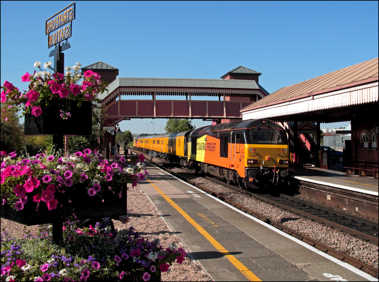My enthusiasm for going out for photographs is inversely proportional to the outside temperature so I haven't bothered during the heatwave during June and July 2018. Although the evening of 10 July was quite warm it wasn't too bad so I had a walk to Stratford-upon-Avon station for a shot or two of 67023 + 67027 with 1Q48, the Derby to Tyseley test train. I took only my lightweight Canon G10 compact camera secure in the knowledge that with its RAW image capability it is more than capable of taking a decent picture without the weight of a DSLR and heavy lens. The train was about 15 early joining the North Warwickshire Line which put it in front of 2S64, the local passenger service from Stourbridge. There was therefore a possibility that it would be routed into either platform 2 or 3 the latter of which had just been vacated by a Chiltern service to Leamington Spa but I was hopeful that it would run as booked into P1. It did and made for an attractive scene as it drew to a halt alongside the beautiful floral display sponsored by FOSS, the Friends of Stratford Station.