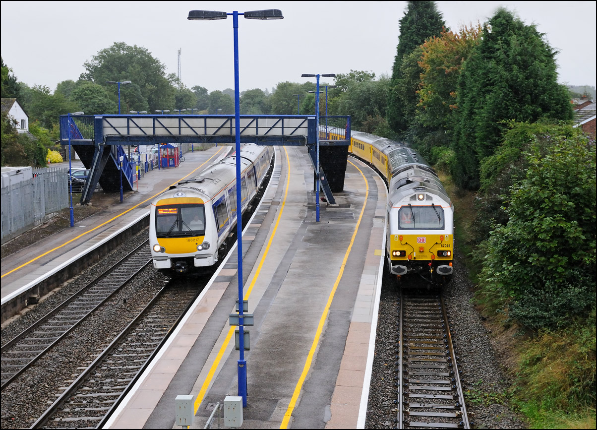 Over the past month or so a test train has run on Thursday evenings from Derby to Old Oak Common and returned north on the following afternoon. Although booked for an HST NMT it has thus far been worked by 67026 and 67016 and is scheduled to stop at Hatton station for a few minutes. Unusually, instead of sitting in Hatton Down Goods Loop the train runs main line as far as the South Junction where it is routed into the Stratford-upon-Avon branch platform. Although some freights use this line to exit from the loop it is still relatively unusual for something to be booked to stop in the platform. As I arrived in the station car park the rain set in and I had quite forgotten that the Theale to Lindsey tanks, 6E55, probably wasn't far away. I had a quick look at RTT and saw that it had passed Warwick so hopped onto the station bridge for a shot as it ran through platform 2. The test train was only a few minutes behind and as the rain became torrential it appeared snaking over the crossover with, thankfully in this light, 67026 leading.