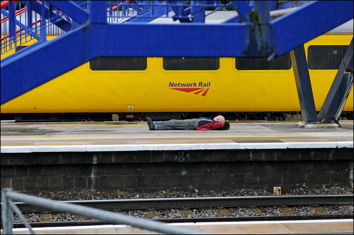 I had thought that the locomotive hauled test train from Old Oak Common to Derby which ran on 17 October 2013 was to be the last photographable for a while because of the autumnal time change but on Thursday 31 October there was still quite a lot of ambient light around at 16.00 with a clearing sky so after checking with RTT that 1Q21 was on time went over to Hatton station to try for an image as 67028 led the train tailed by 67026 onto the Stratford-upon-Avon branch where, from platform 1, it would be framed by signals as it crawled to a stop. I soon heard the sound of a class 67 approaching the junction from the main line and was pleased that the whole train just fitted into the gap between the signals although the green aspect for the up main line was shining straight into my camera's lens and caused some burned out highlights. I like the challenges of both taking and processing minimum light photographs; full sun "on the nose" images are fine but don't really need any thought or more than basic Photoshop skills. On a previous visit to Hatton for this working I saw a waiting passenger lying under the footbridge. It wasn't a one-off; here he is once more... Although booked to stand in the branch platform for several minutes, on occasion 1Q21 had barely drawn to a stop when the signal protecting the down main and Stratford lines was cleared leaving no opportunity for another shot from the roadbridge.
