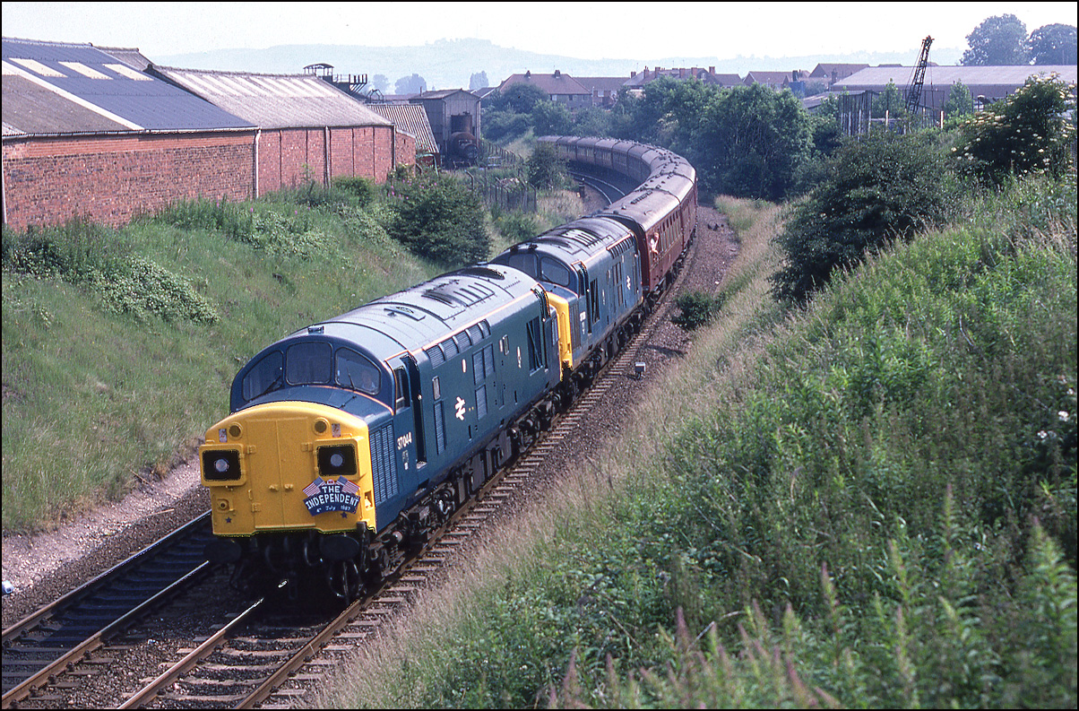 With 37091 now leading 37044, the train was photographed going past the site of Blowers Green station,