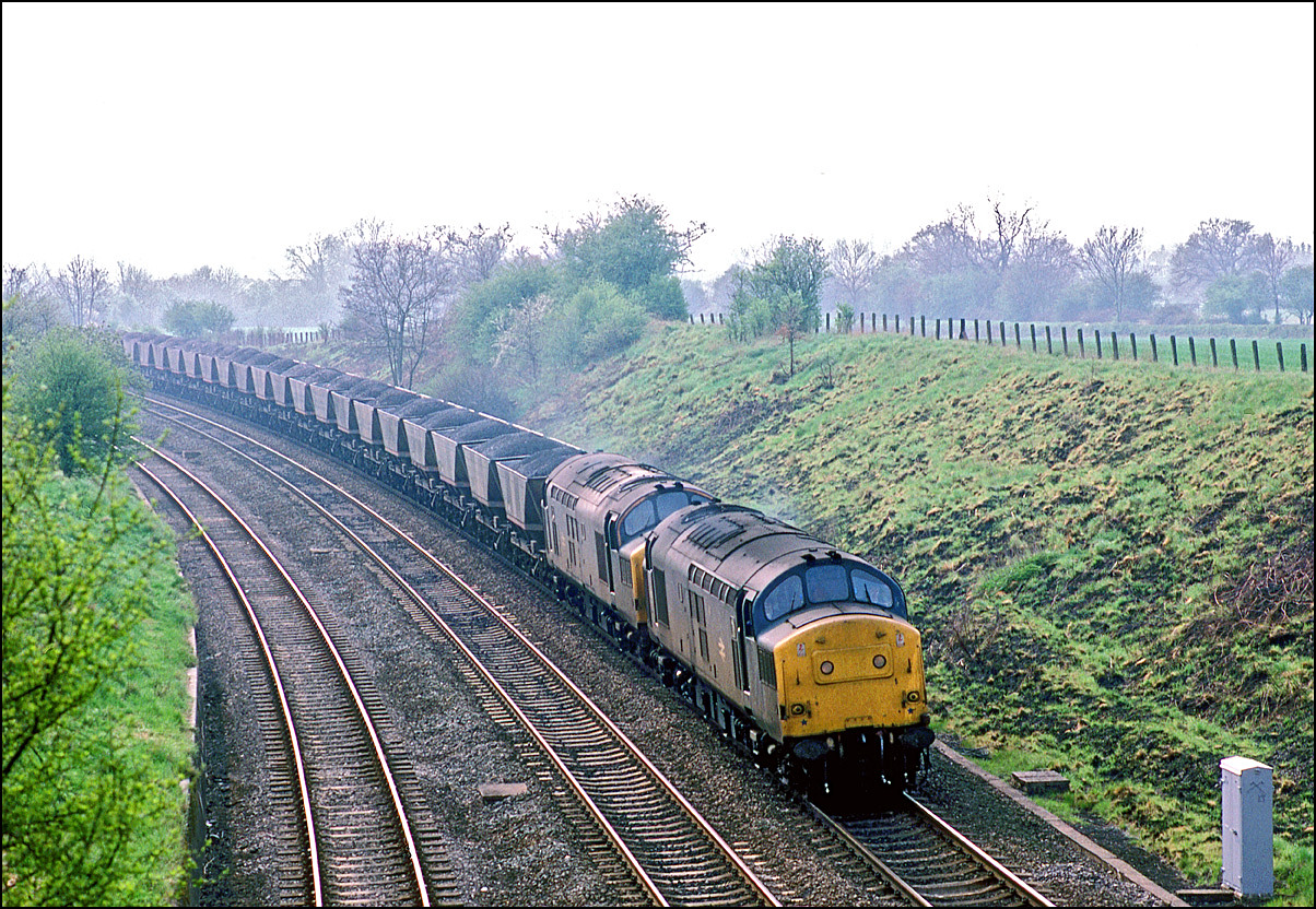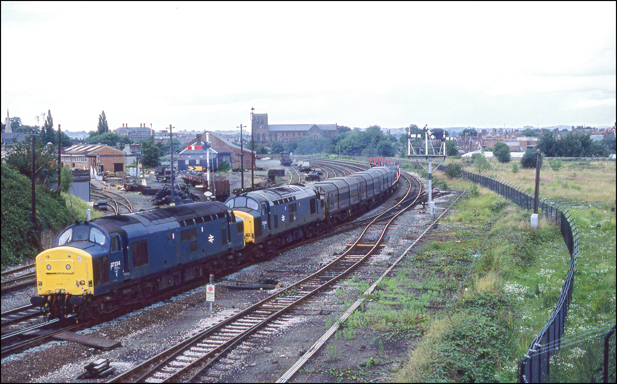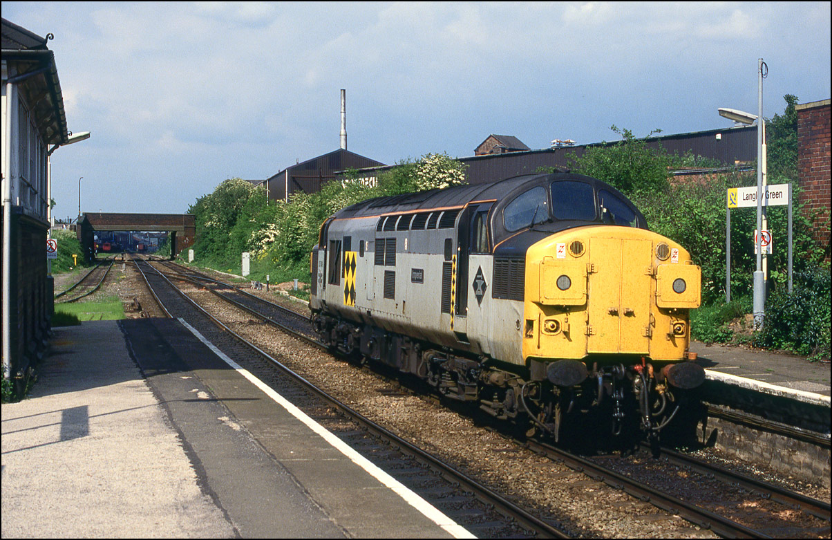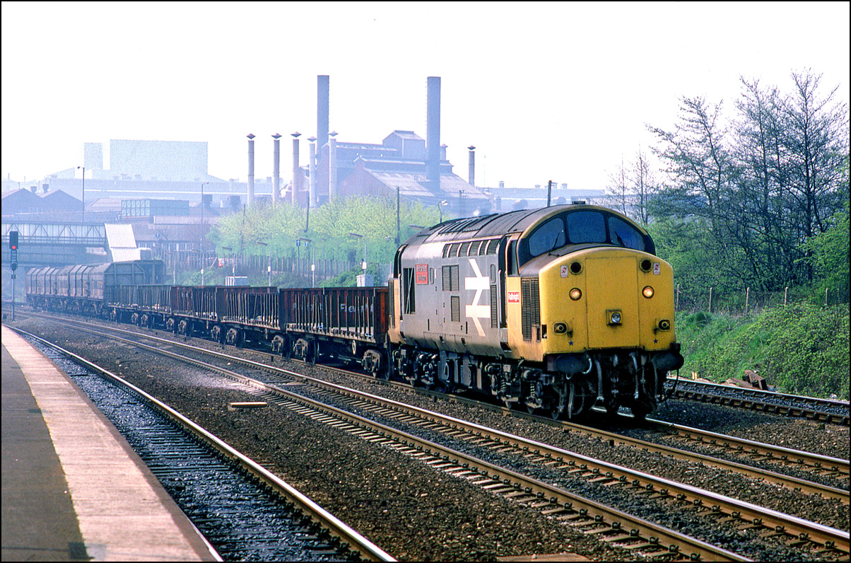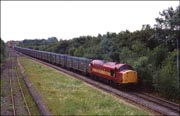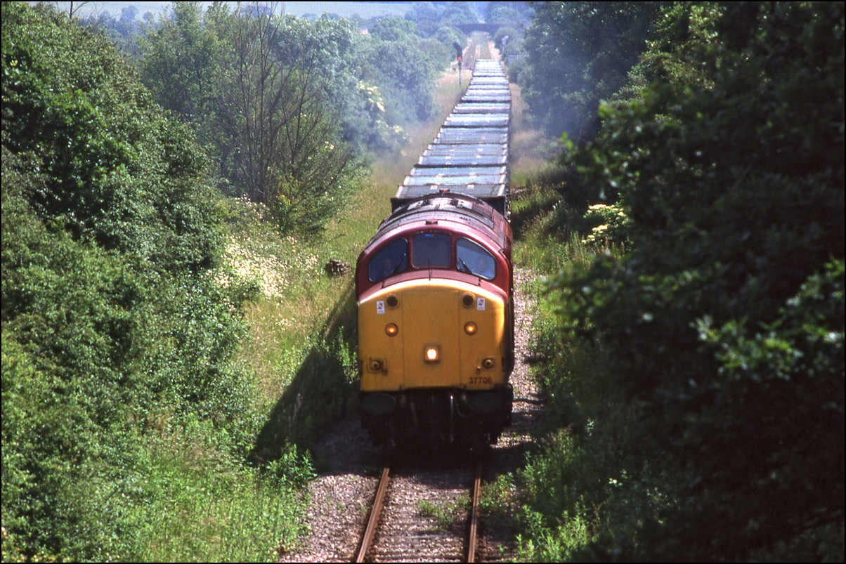 Here is one of the re-engined class 37/9 locomotives, 37902, at Whitacre Junction on 13 May 1992. The first section of the train was a rake of scrap wagons from March heading for Margam in South Wales.