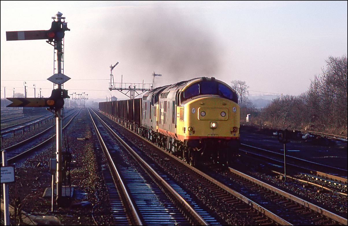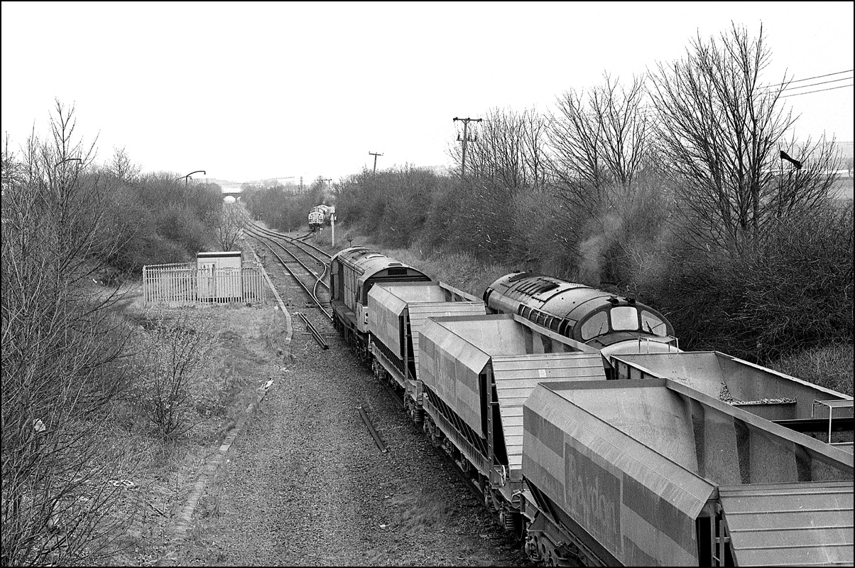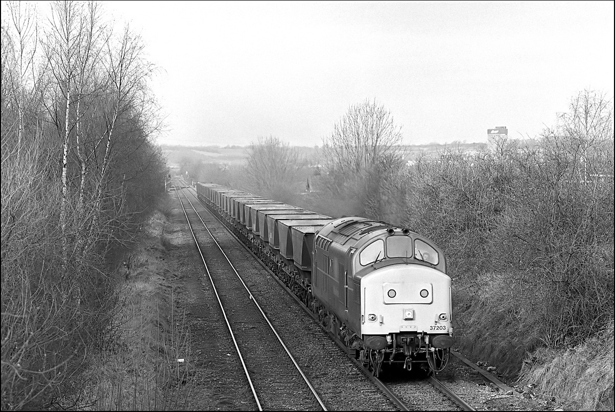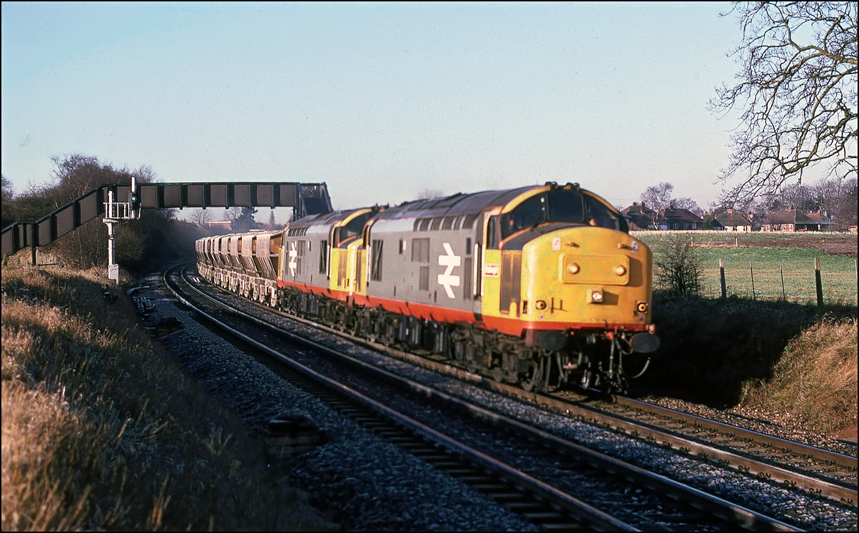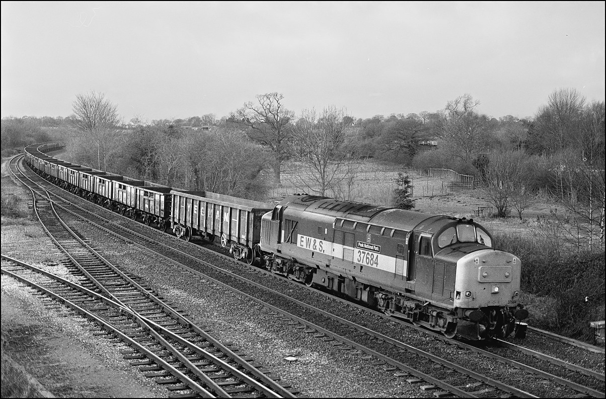 This is the shot mentioned above showing 37684 + 37676 on the Washwood Heath to Peak Forest stone empties just about catching the sun beyond Water Orton on the frosty morning of 6 February 1988.