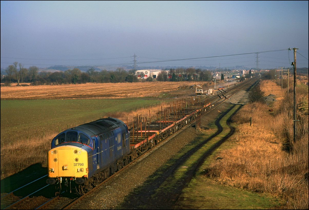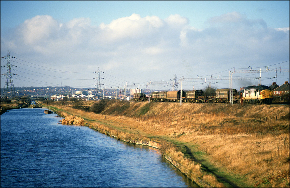 3 November 1990, 37359 was provided. The ensemble is seen here, just catching the low winter sun, passing the now-closed Rover factory at Longbridge in the West Midlands. The scene here has been transformed by the erection of overhead catenary used by the