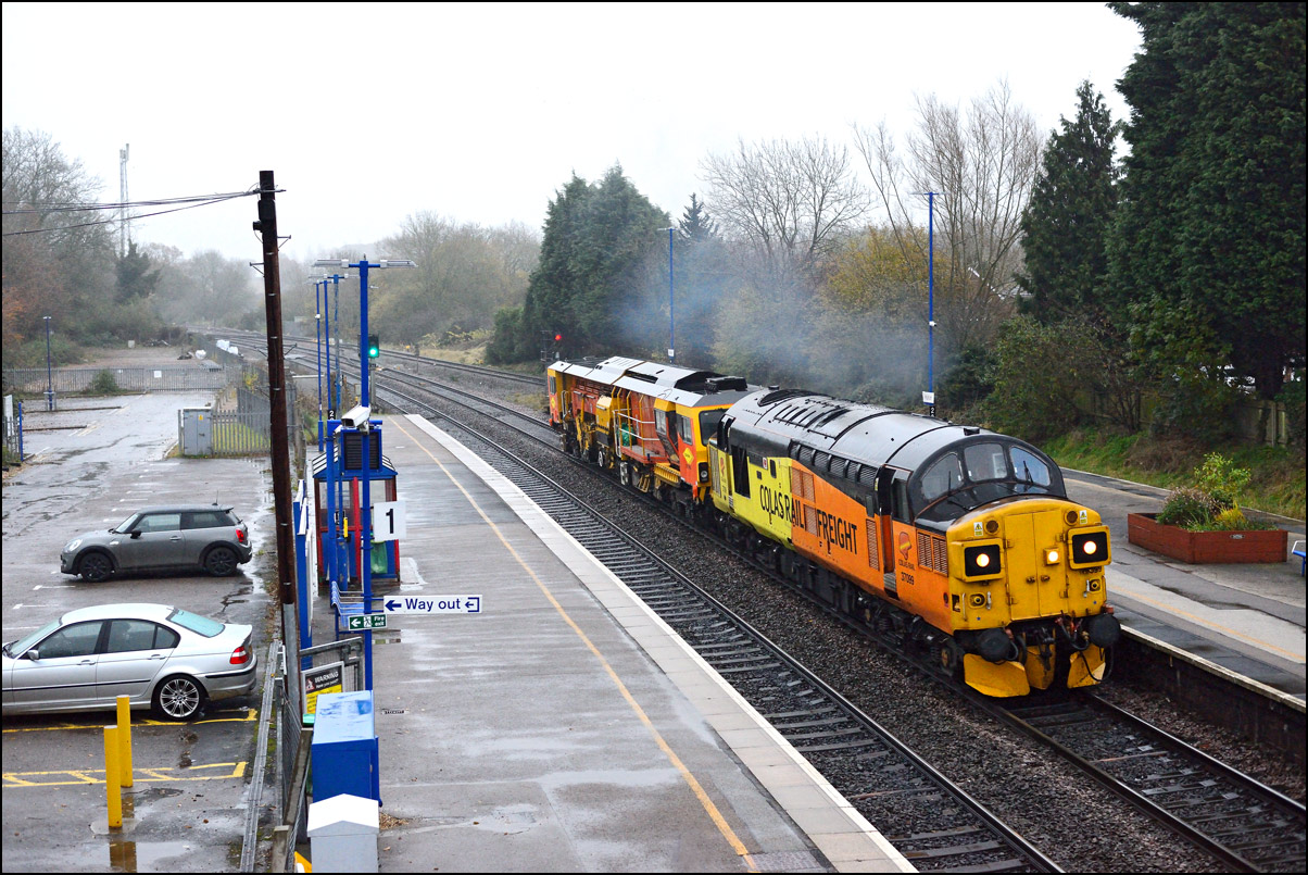 of the Stratford-bound train for this photograph, as he pulled away from the station stop very slowly indeed so as not to block my view of 37607 leading 1Q13 into the platform, the signal