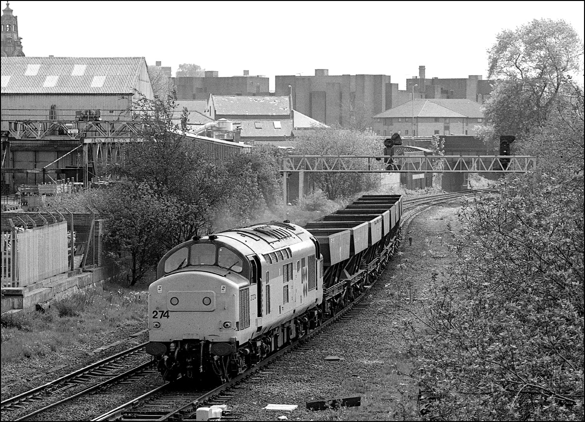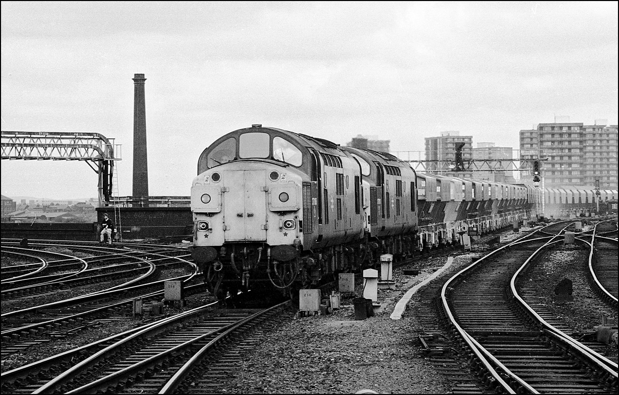 This is the same train, the Peak Forest to Salford stone, as the one shown above but with 37126 + 37013 and at the east end of Manchester Victoria on 29 May 1984. The steepness of the bank from Miles Platting