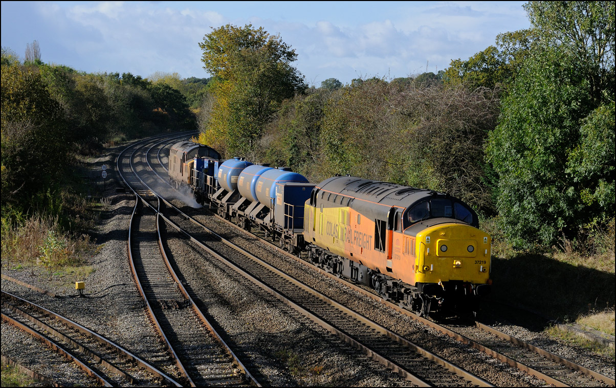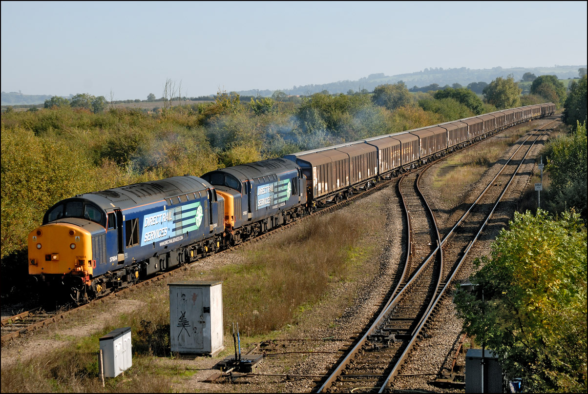 would be largely shadowed. My 80 - 400mm lens helped me to avoid most of the shadows and bring out some decent autumnal colours. Here is 37407 with 350232 and 350239