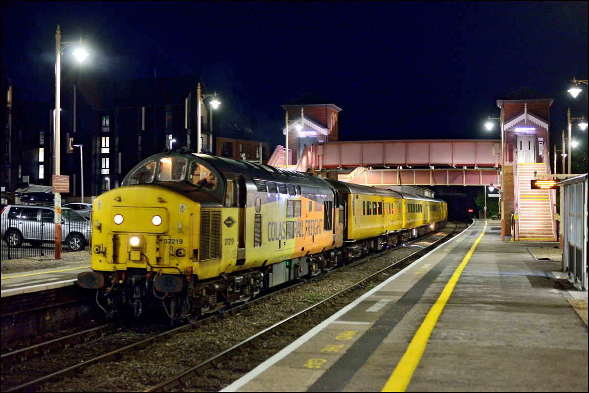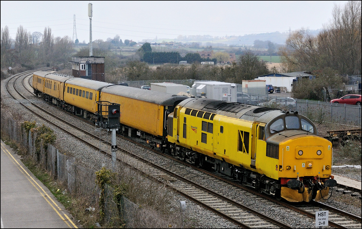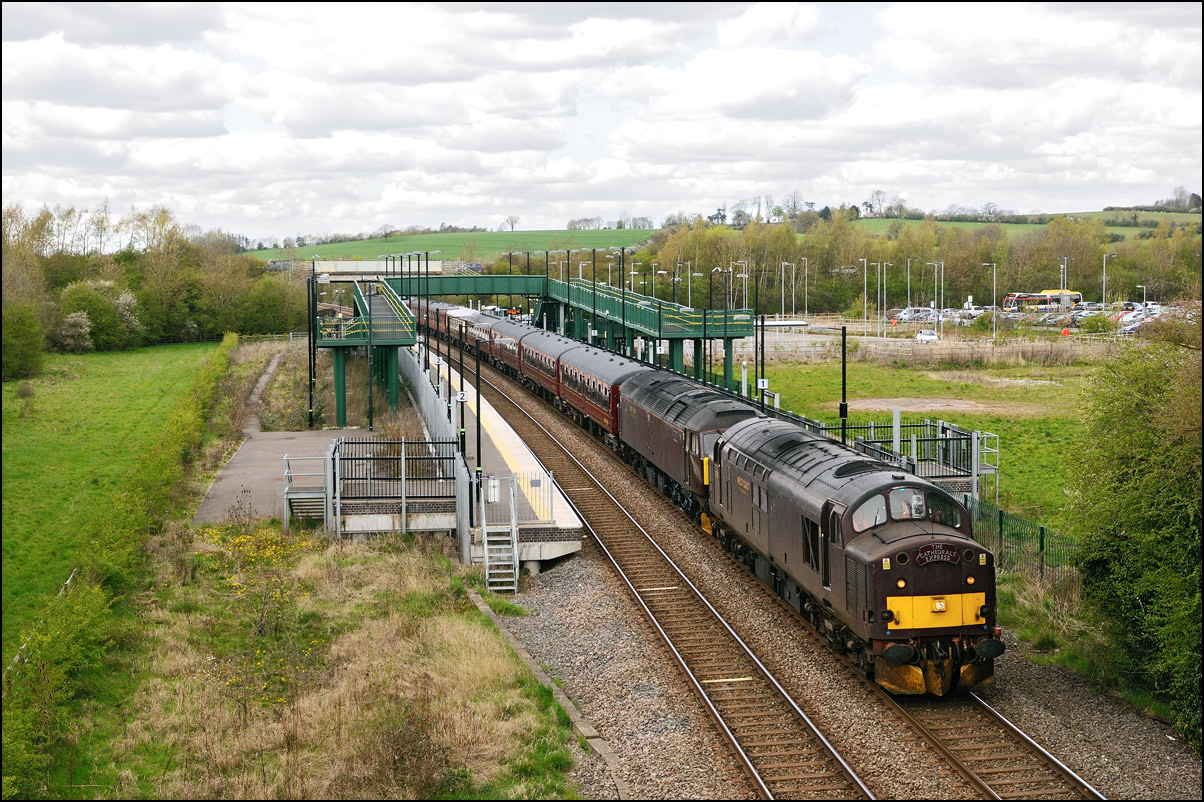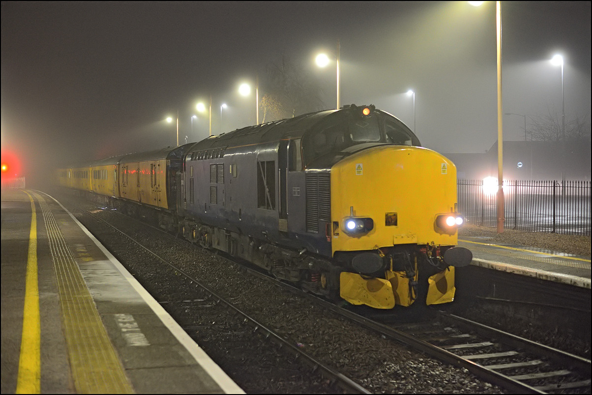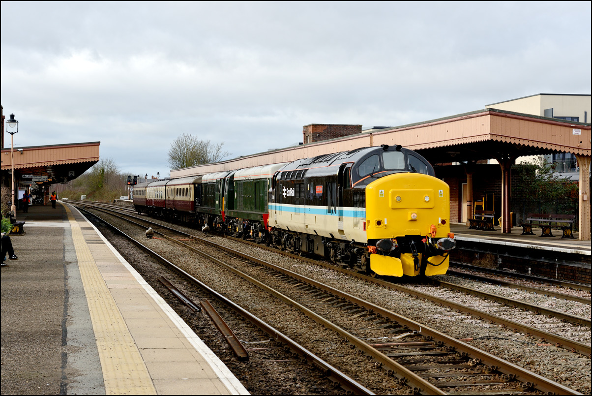 to Derby. The weather was vile during the first part morning with mist and drizzly rain being the main features until the real rain set in later. Here is 1Q13 arriving at Stratford-upon-Avon spot on time, with 37218 leading, in dreadful light. It's lucky that the train