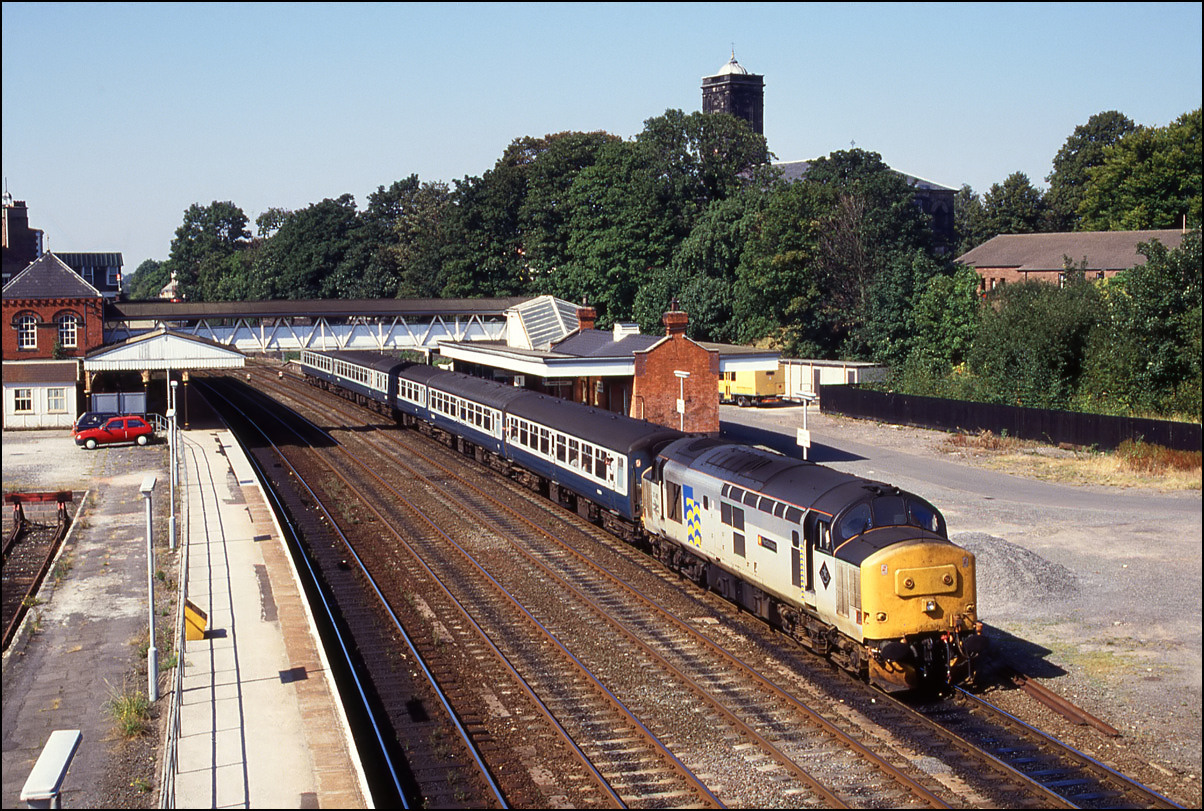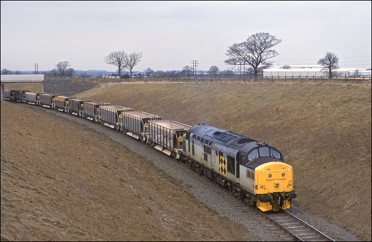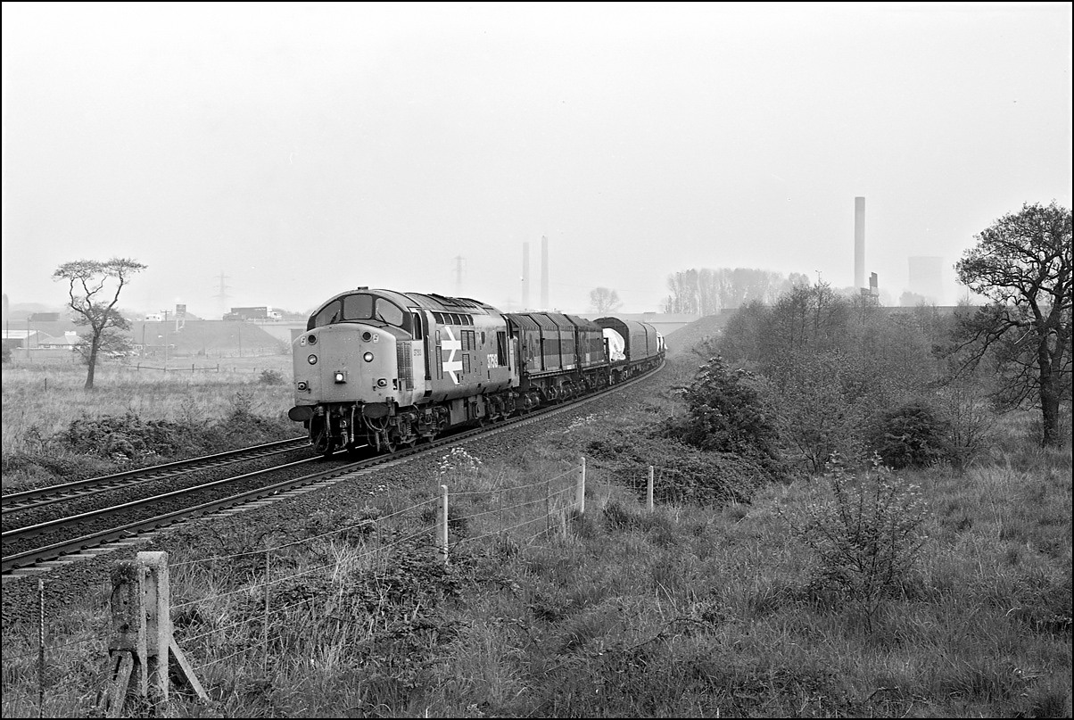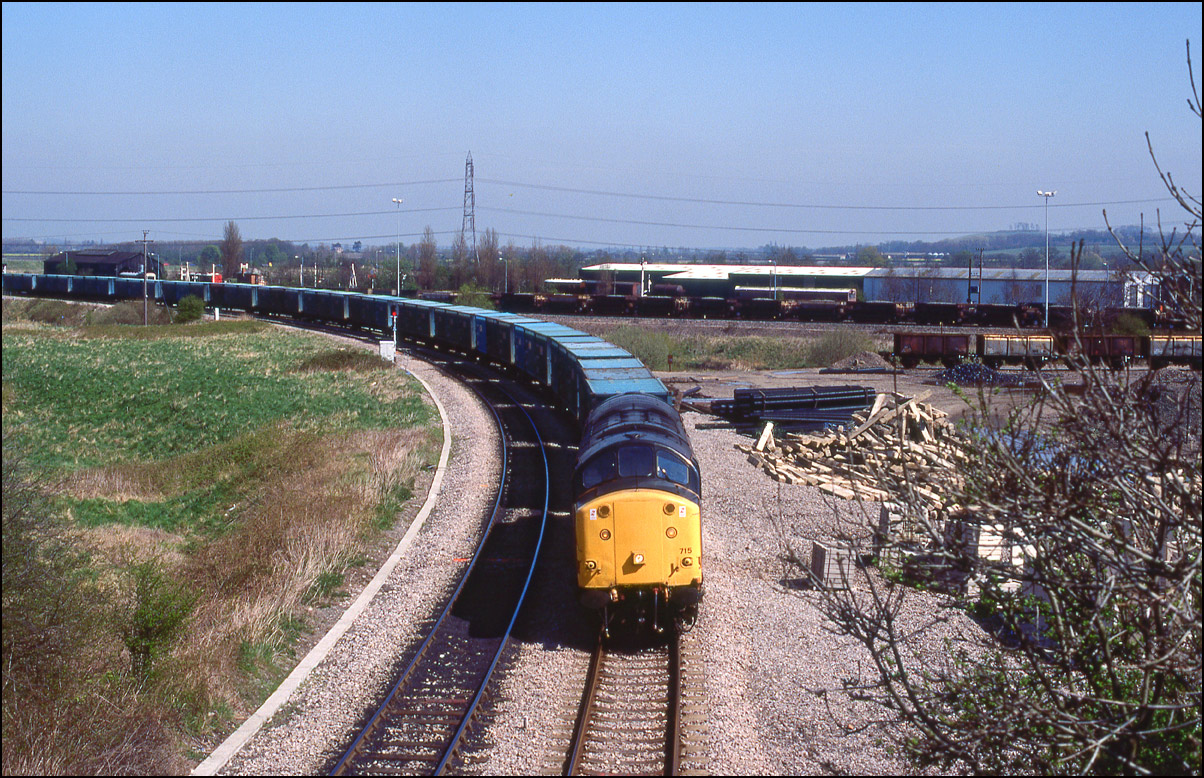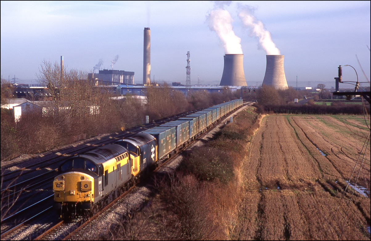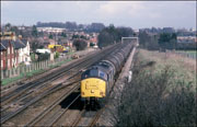 This is 37515 passing Tutbury & Hatton on the Uttoxeter line on 13 April 1995 with an additional working from Tees to Etruria. The shot was taken using a 210mm lens in order to compress the perspective and bring the interesting background into clearer view.