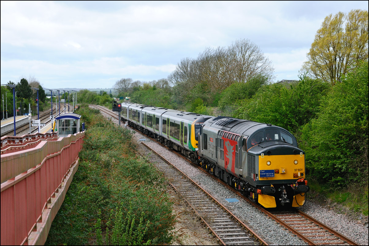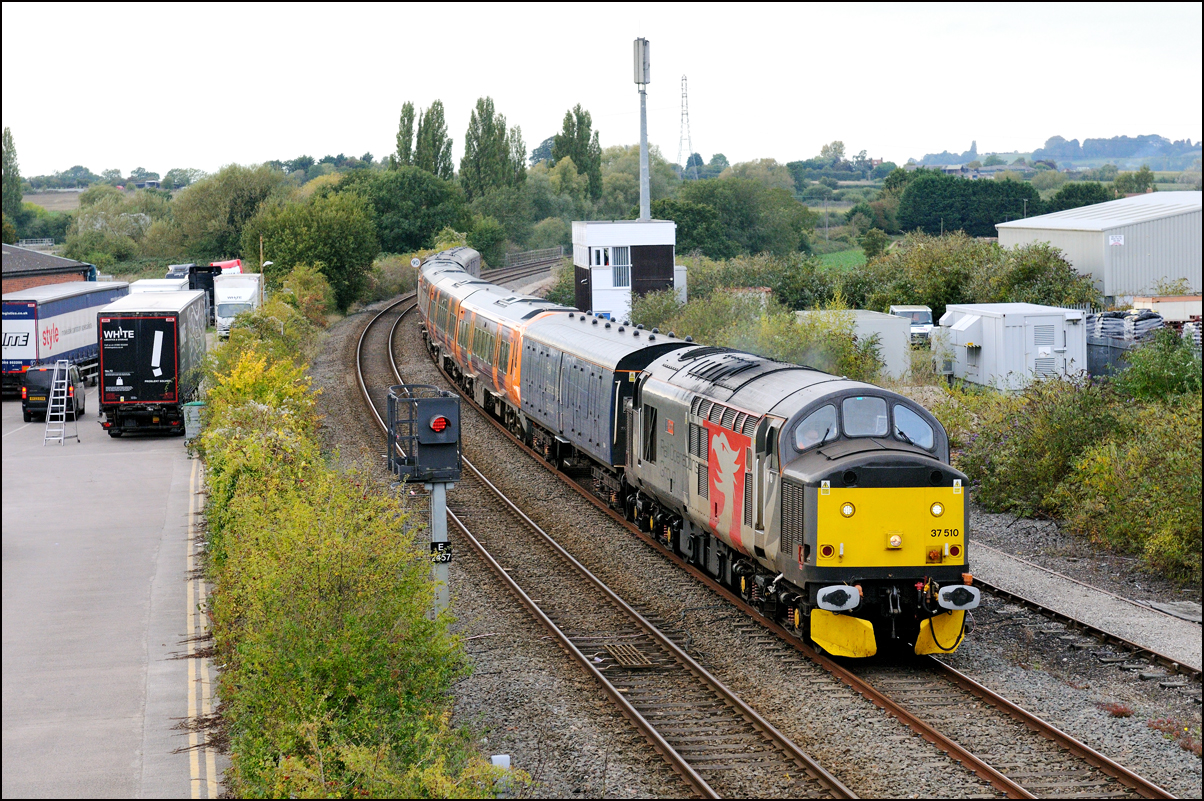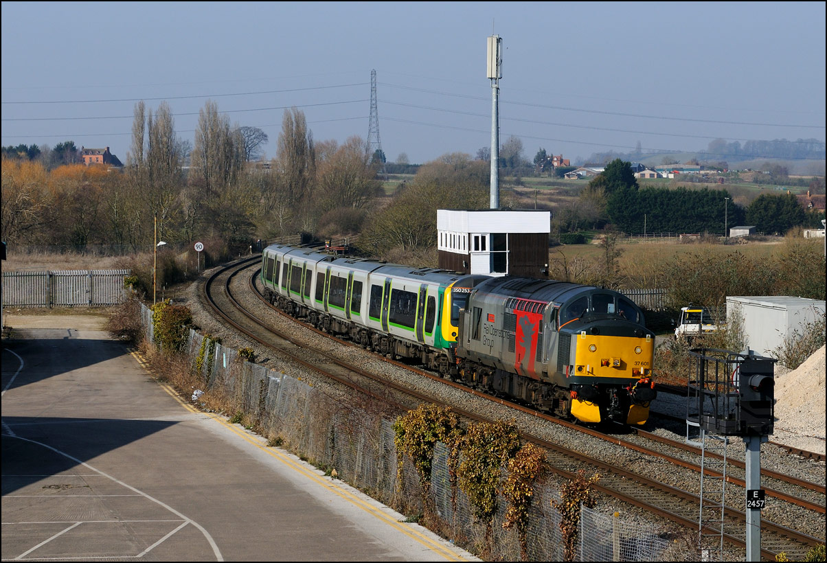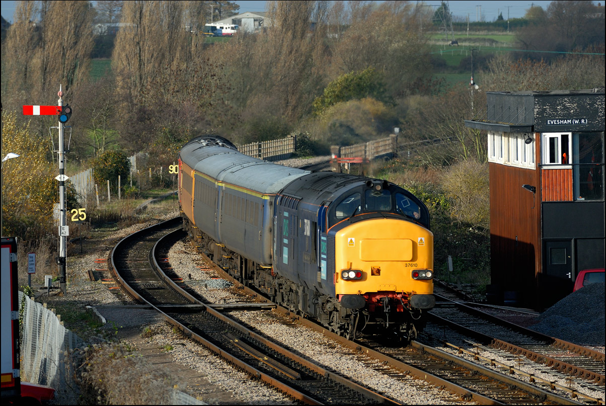 that a short diversion would be worthwhile even though the light was dreadful. Here then is 5Q91 with 37407 hauling 350263 + 350260 past the signalbox and towards Evesham station.
