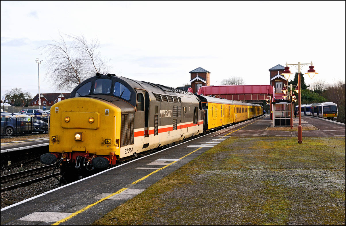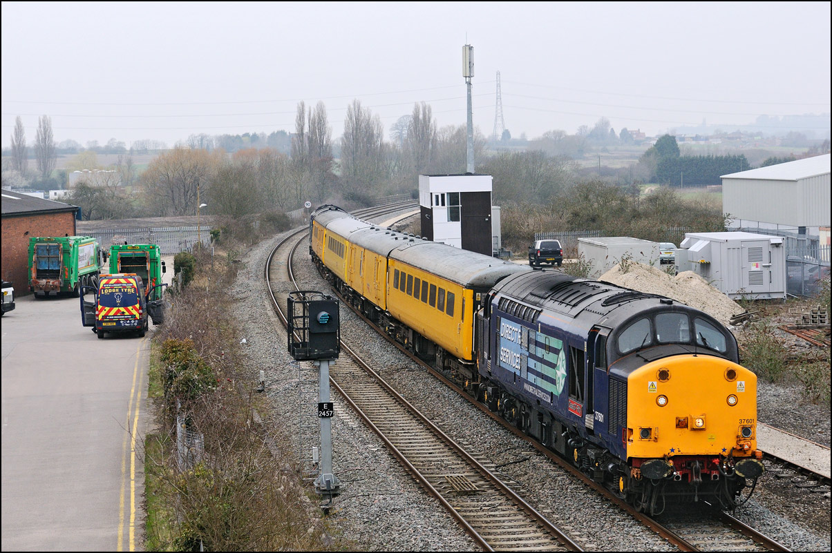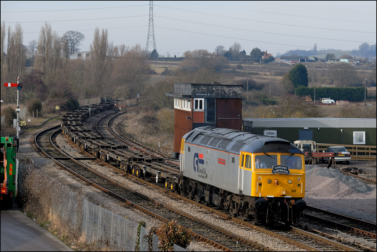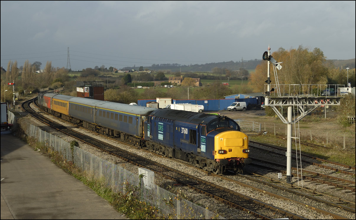 that a short diversion would be worthwhile even though the light was dreadful. Here then is 5Q91 with 37407 hauling 350263 + 350260 past the signalbox and towards Evesham station.