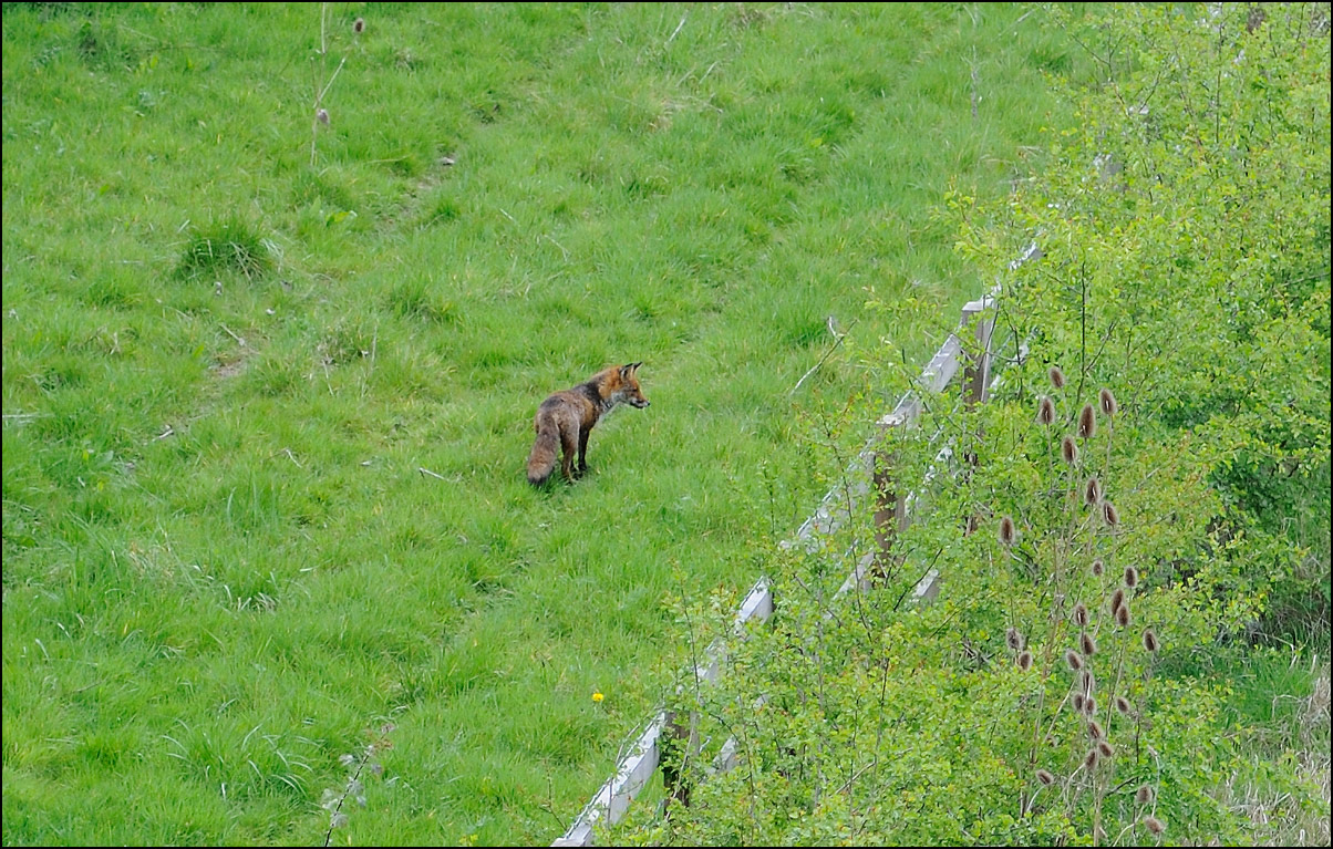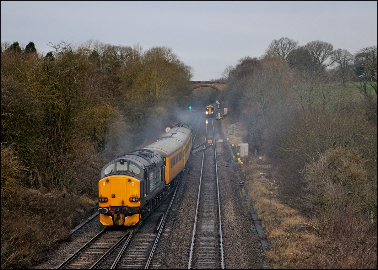 The reversals around the triangle meant that 37218 was now leading again and here it is, with 37607 also under power on the rear, storming away towards Birmingham. I watched the train going away towards the tall bridge at Shrewley and the whole of the cutting was obscured