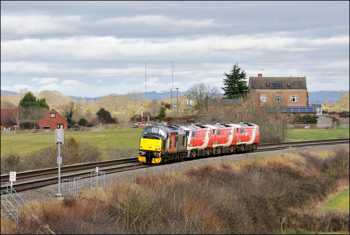 but it was too late by then to get to the spot I had planned and walked along a muddy footpath so just went to Evesham. The train, hauled by 37800 with 769421 working as 5Q94 from Allerton Depot,