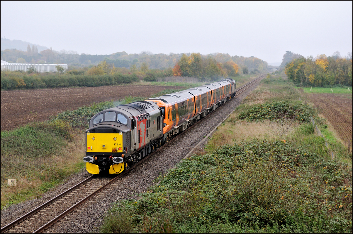 6M67, the Bridgwater - Crewe nuclear flask train was running in the region of an hour early on 2 November 2007 when it came north past Defford in Worcestershire, passing Defford at 13.38 behind 37510 + 37194. I can't admit to getting fired up by these very short trains, despite the in-vogue motive power, but