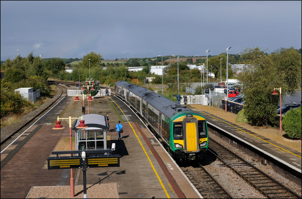 The mainline registered 40145 hauled a railtour from Castleton in Lancashire to Stratford-upon-Avon on Saturday 1 October 2016. This was the first time that I had seen a member of the class here although while waiting for 1Z49's arrival was shown a picture of 40078 standing in the ertswhile goods loop on an Adex some years ago. I was mostly interested in taking an image of the train's arrival rather than anywhere else and as the day had been dull and wet thought that a shot from the new bridge as it ran into platform 2 would be the best bet. As I prepared to leave home for the short walk to the station the sun came out fully and stayed out when 172337 forming 2S42 from Stourbridge Junction arrived, also into platform 2 rather than its booked platform 1. This made me wonder if 40145 would go into P1 which, if the sun were out, would be absolutely spot on for the light. It didn't but the sun did find a small piece of cloud at just the right moment and so avoided one of those awful contre-jour pictures which tempt some into over-use of the shadows and highlights tool on Photoshop without altering the parameters governing the tonal width and radius of the settings resulting in very strange and over-processed-looking images. Given the circumstances I was reasonably happy with the result and noticed the faint rainbow in the right background only when uploading the image file. |