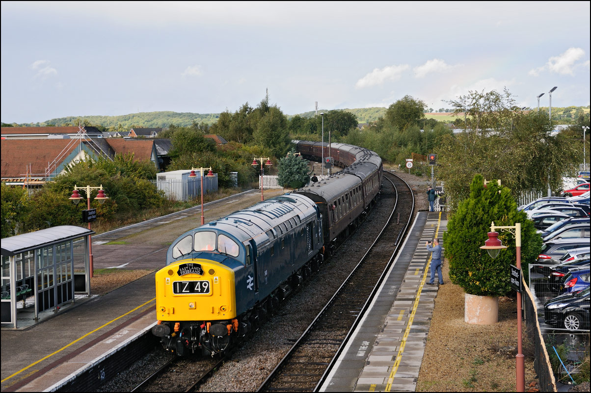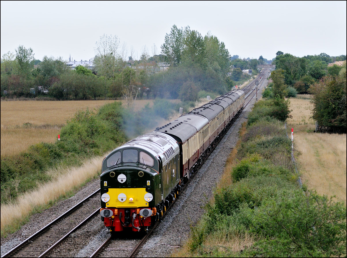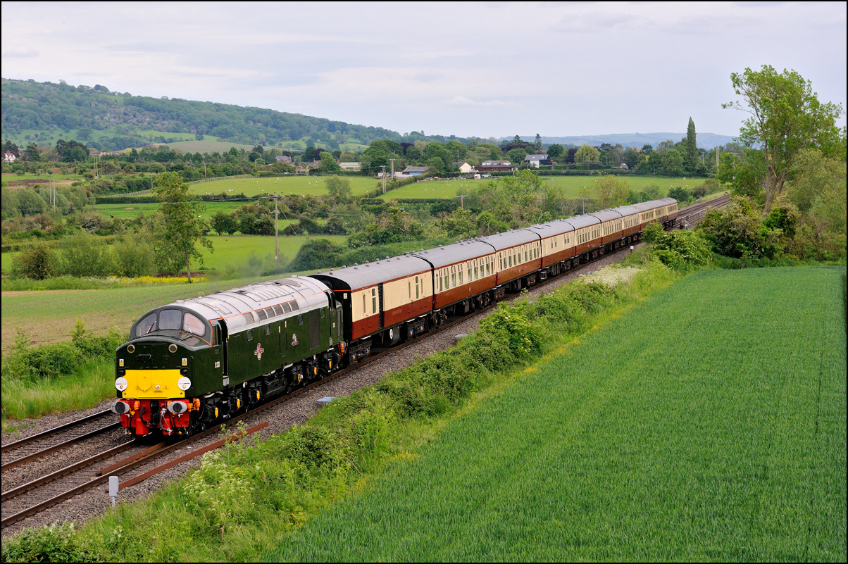 To mark 50 years of Pathfinders (formerly F & W) Railtours a specially anniversary train was run from Burton on Trent to Weymouth. Somethin a bit special was clearly required to haul it and LSL's 40145 was the chosen locomotive. I chose to go to Claydon in Gloucestershire with the idea that there probably wouldn't be many other photographers there and sure enough there was just the one. The train, 1Z40, with 47815 on the back to help shunt at Weymouth and probably give a shove up Sapperton Bank, ran on time and passed at a very good rate of knots making a fair old noise. I took a short video clip which suffers a bit from wind noise not to mention my camera in rapid-fire mode! |
