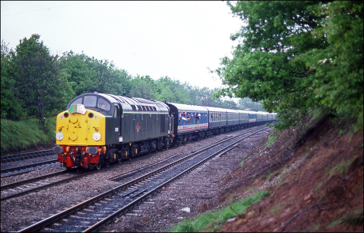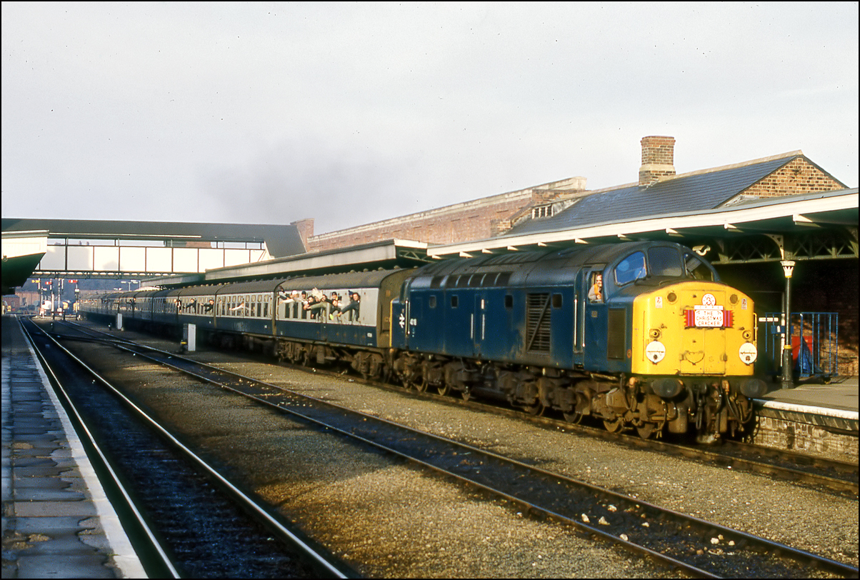 Privately owned 40013 has been leased to Locomotive Services Limited for 3 years and is to be used for mainline charter work. One of the first ran on 3 June 2021 was the return leg of a Carnforth to Bristol charter operated via Hereford with steam locomotives from Crewe and which 40013 hauled for the rest of the journey returning via Cheltenham and Birmingham. The weather was dull but improving and I wanted an open shot that would be good if the sun happened to appear so went to Defford, a good standby location in the afternoon. The train, 1Z72, ran very close to right time and made an impressive sight with the its matching rake of Mk2 coaches. My personal preference would be to see it in BR blue as seen here in Manchester Exchange station on 6 December 1984 but it is still good to have a shot in an earlier colour scheme. |