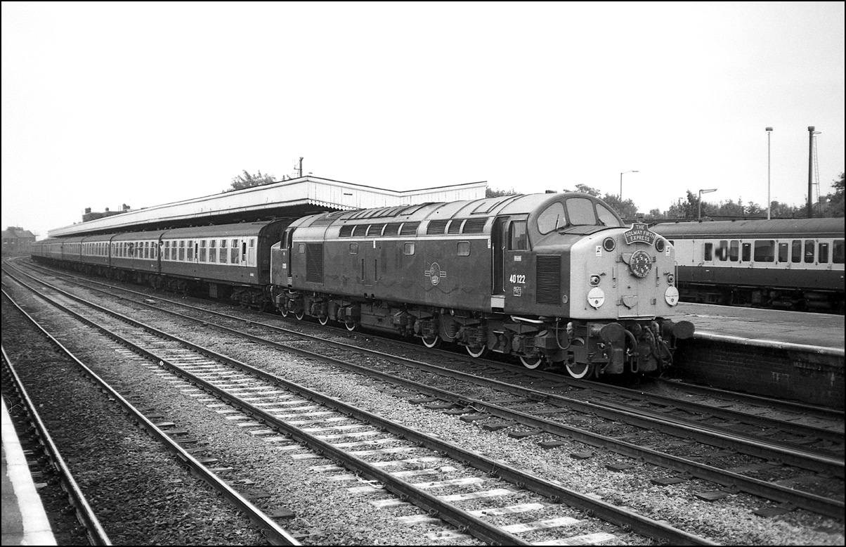 I had forgotten about this train until going through a file of black & white negatives. It shows 40122 at Leamington Spa on 8 September 1984 while working the Solway Firth Express, 1Z39, from London Victoria to Carlisle. As is all too obvious the weather was dreadful and after looking through my colour slides remembered that I didn't even attempt a shot except this one on Ilford FP4 in a Ricoh fixed lens compact camera. |