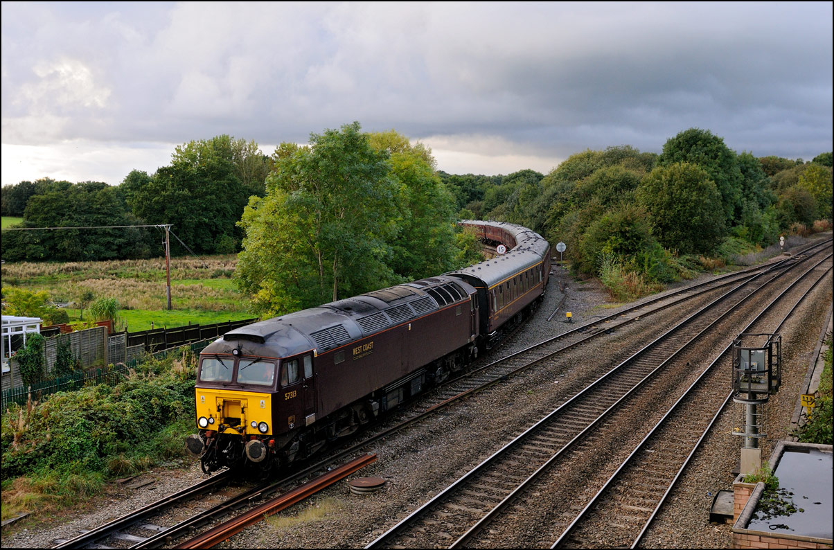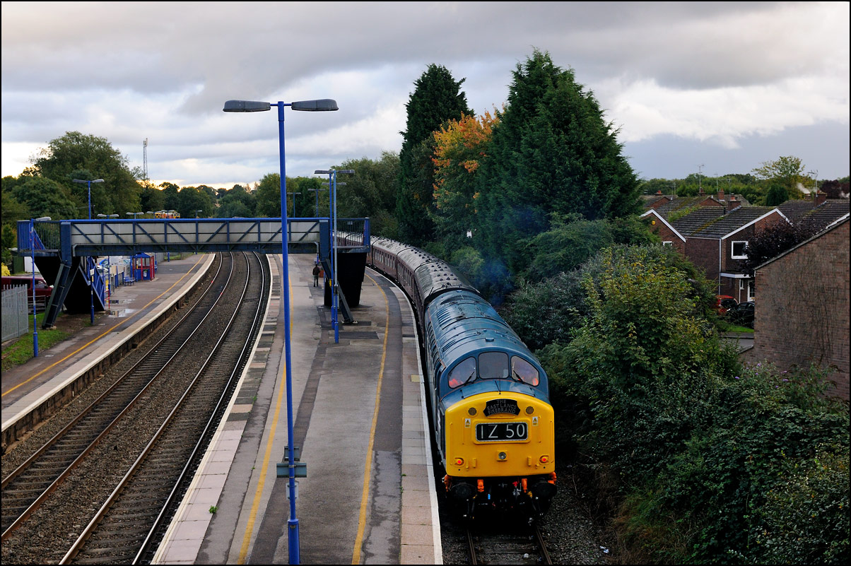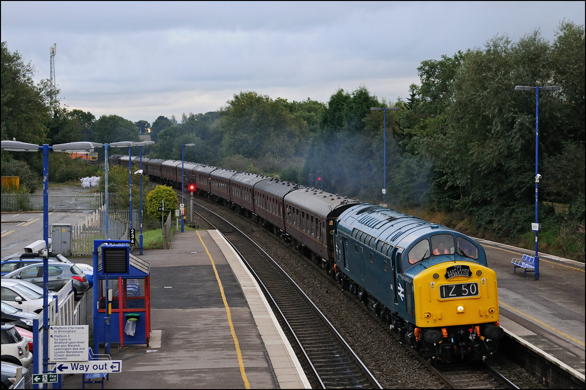 After leaving Hatton 1Z50 ran to Warwick where it waited on the up line until Chiltern's 1R45 had passed by on the down line. It then, with 40145 now leading, used the emergency crossover to gain the down line before starting the run up Hatton Bank. The light was dreadful and a wet and muddy walk to Hatton North Junction seemed pointless so I decided on this shot as the train ran through the platforms at Hatton station; an easily recognisable location rather than some attractive but slightly featureless countryside. I'm not one for adjectival excess in photo captions but will say that it was good to see and hear the elderly English Electric locomotive hauling 10 coaches and a dead class 57 climbing the 1/110 gradient with a decent show of exhaust. |