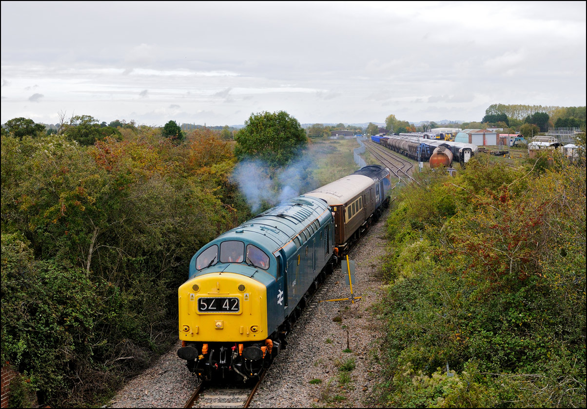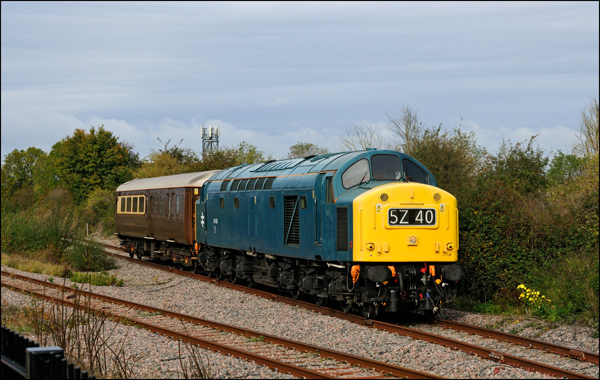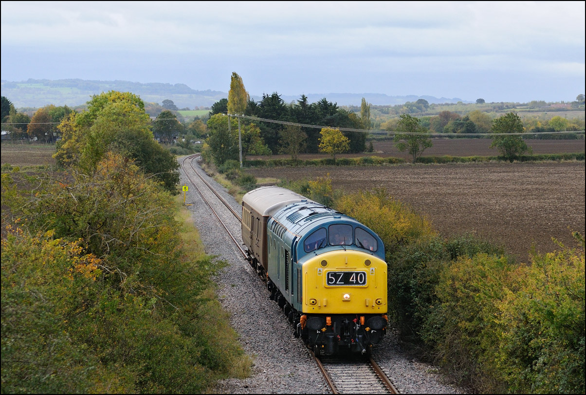 Class 40 40145 was soon ready to leave Long Marston with 5Z42 on 9 October 2020 and is shown here as it joins the branch to Honeybourne with a small plume of exhaust smoke and a good reminder of the English Electric whistle from the turbochargers. |