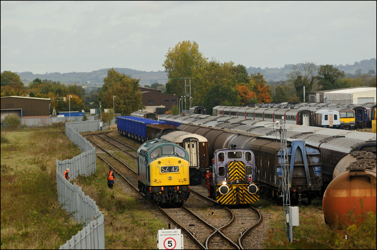 The EMR power car 43058 was waiting in No2 road at Long Marston on 9 October 2020 and the resident shunter soon detached the barrier coach and propelled it into place ready to form 5Z42 to Crewe. The class 40's crew had already changed the headcode panel (how good to see an operational one in use...) and it wasn't long before the shunting and brake tests had been done ready for departure. |