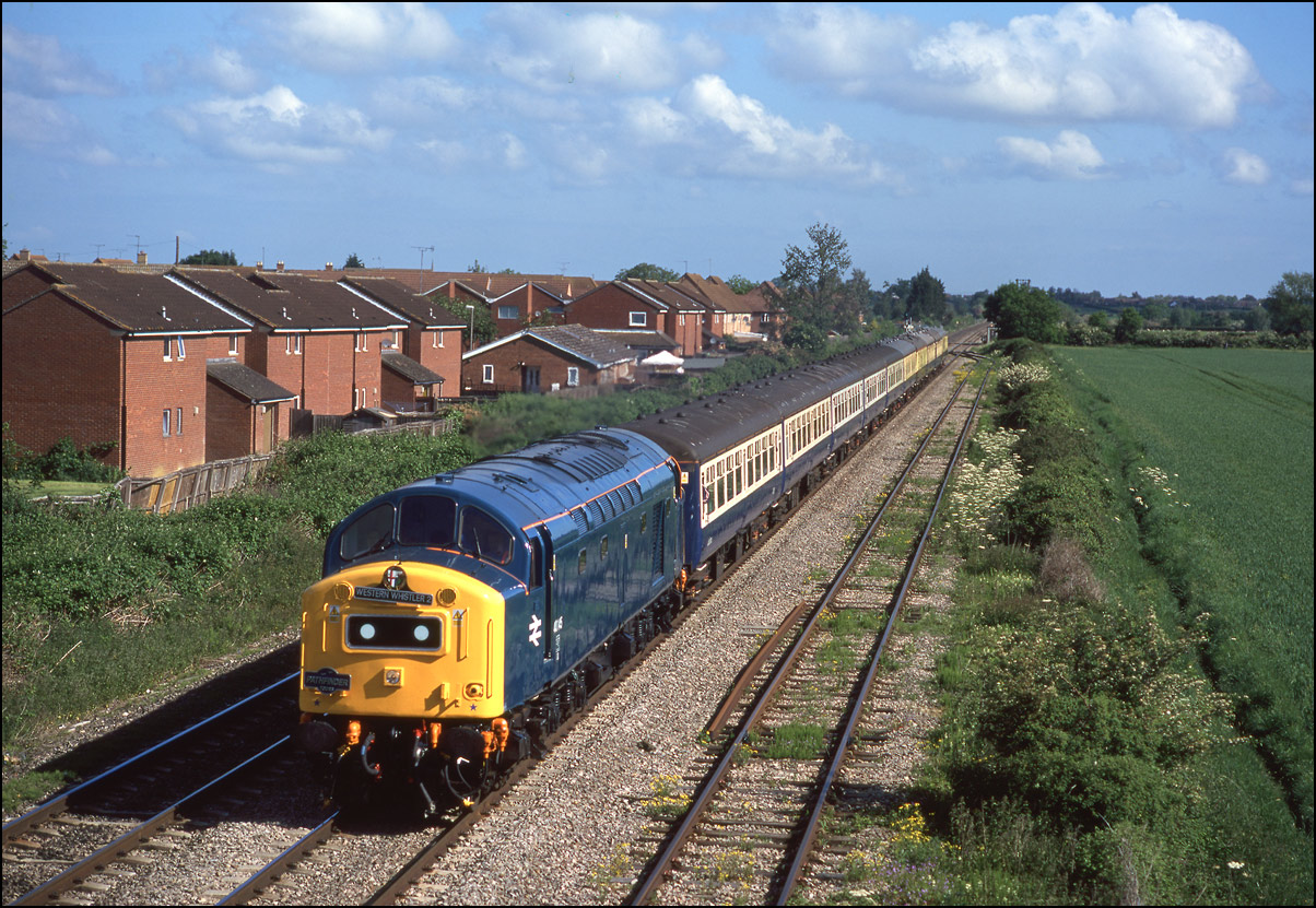 I can't remember if this railtour from Crewe to Plymouth marked the first outing of newly restored 40145 but I do recall that there were an awful lot of pther photographers on the footrbdige at Northway when it ran on 22 May 2004. The sun looks as if was in and out if the clouds are a guide but all was well when the distinctive nose of the old locomotive came into view on the long straight from Bredon. 645 |