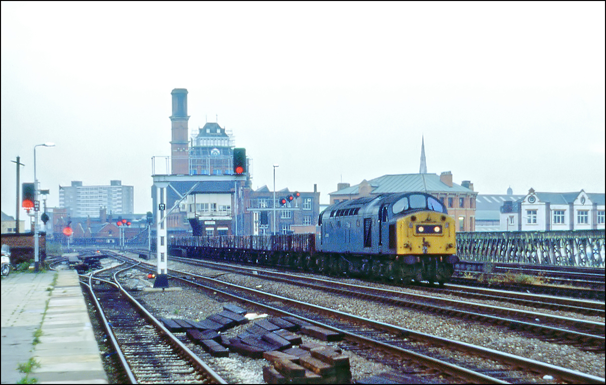 It was also dark in Manchester on the late afternoon of 1 November 1984 when I took this picture of 40168 on a set of old 4 wheel mineral wagons. It so dark that the red signals, including the old-style searchlight variety, show up more than usual. This image was barely worth the time used in scanning and post-processing but time has lent some added interest to the scene. |