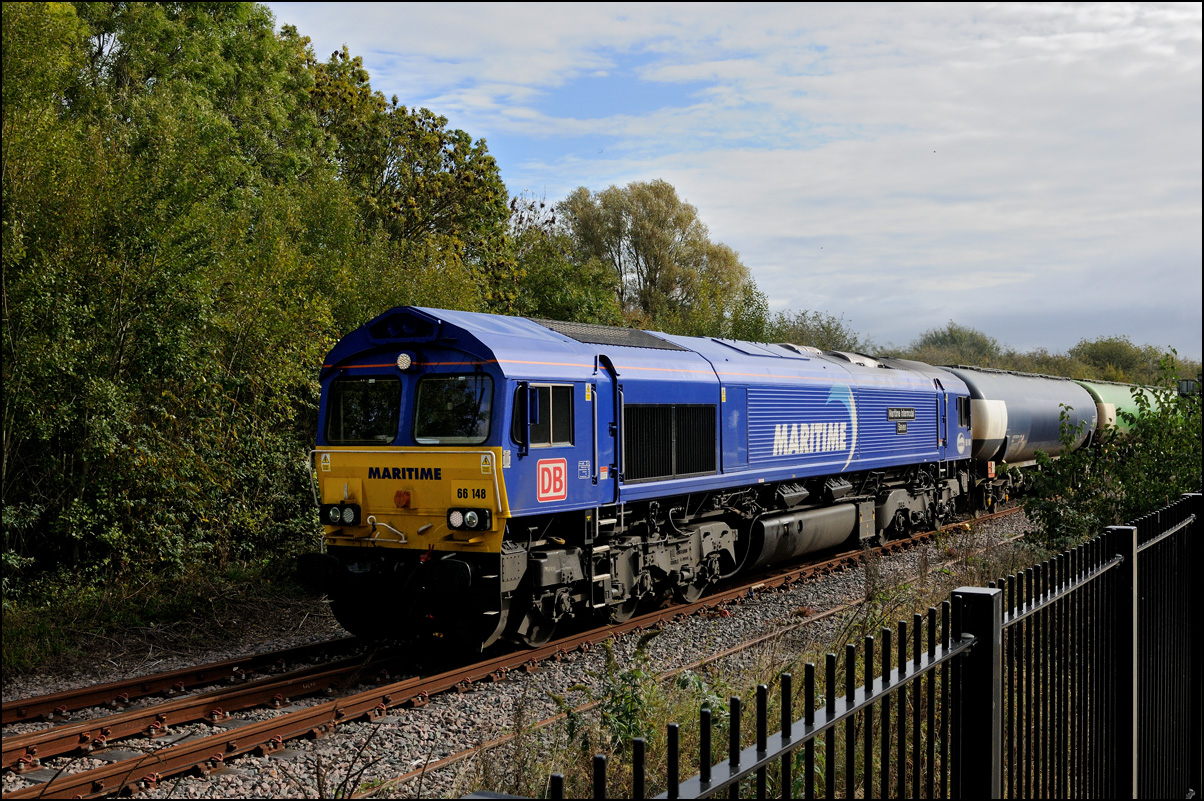 As I approached Honeybourne of 9 October 2020 the sun began to appear and came out fully as the walk along the up platform towards the sidings was made. The bushes between the branch and sidings are a bit of an irritant but who cares when a picture of the first class 40 to visit here was available over the fence?! The train headed by 66148 was standing at the signal just behind the camera and it soon pulled away towards Worcester. I have always liked class 40 locomotives and was fortunate that I started "serious" photography in time to see some examples in service before their withdrawal from service. There are some of these pictures to be found here. |