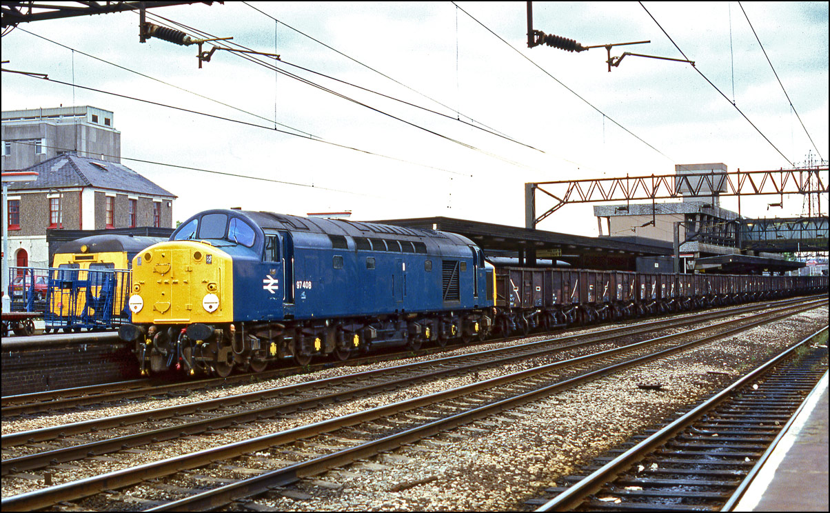 I had just arrived at Stafford on 11 June 1985 when a cleaned-up 97408 (40118) ran through the platforms after arriving with a ballast train from the Stoke-0n-Trent direction. I don't always take light engines but this ws my first sight of a recently withdrawn class 40 temporarily reinstated as part of the departmental fleet. |