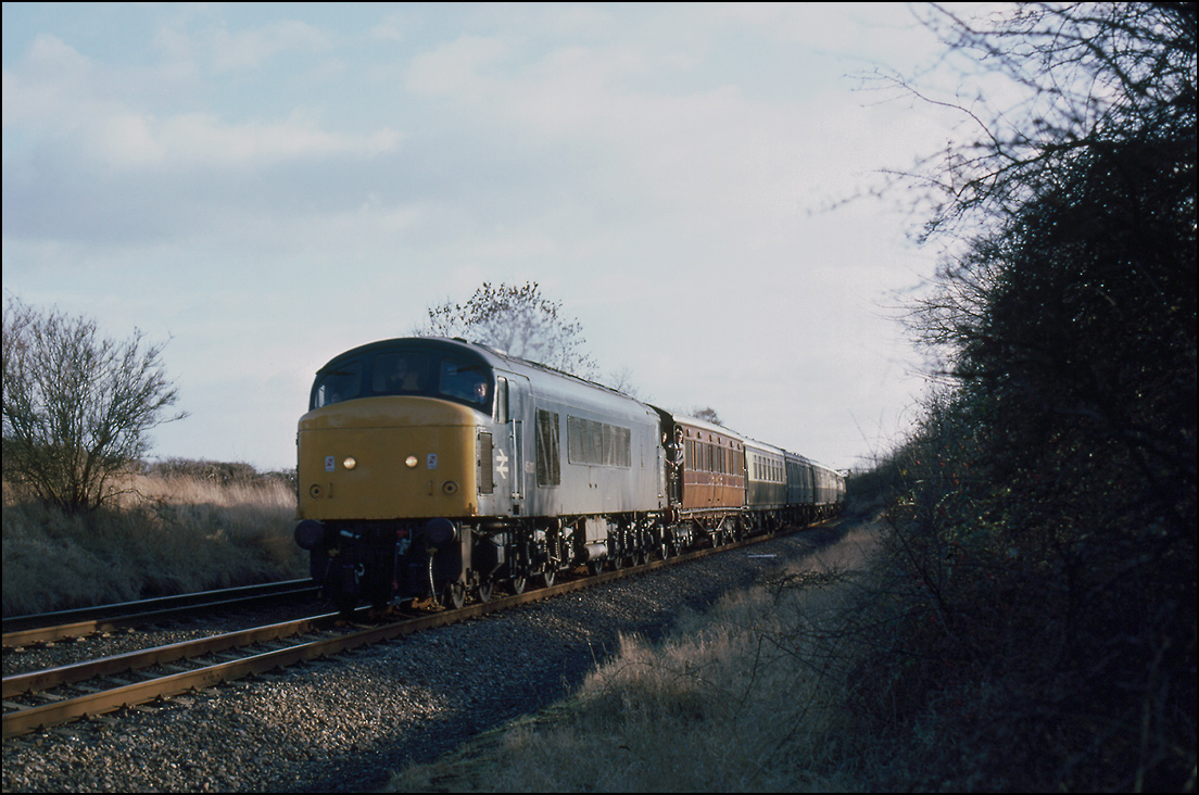 I think that this was my first visit to Long Marston to photograph a train. The date was 18 October 1986 and the occasion was HR's Worcester Sorcerer with 37306 and 45144, trailing here, which visited the branch and MOD site as part of the tour's itinerary.