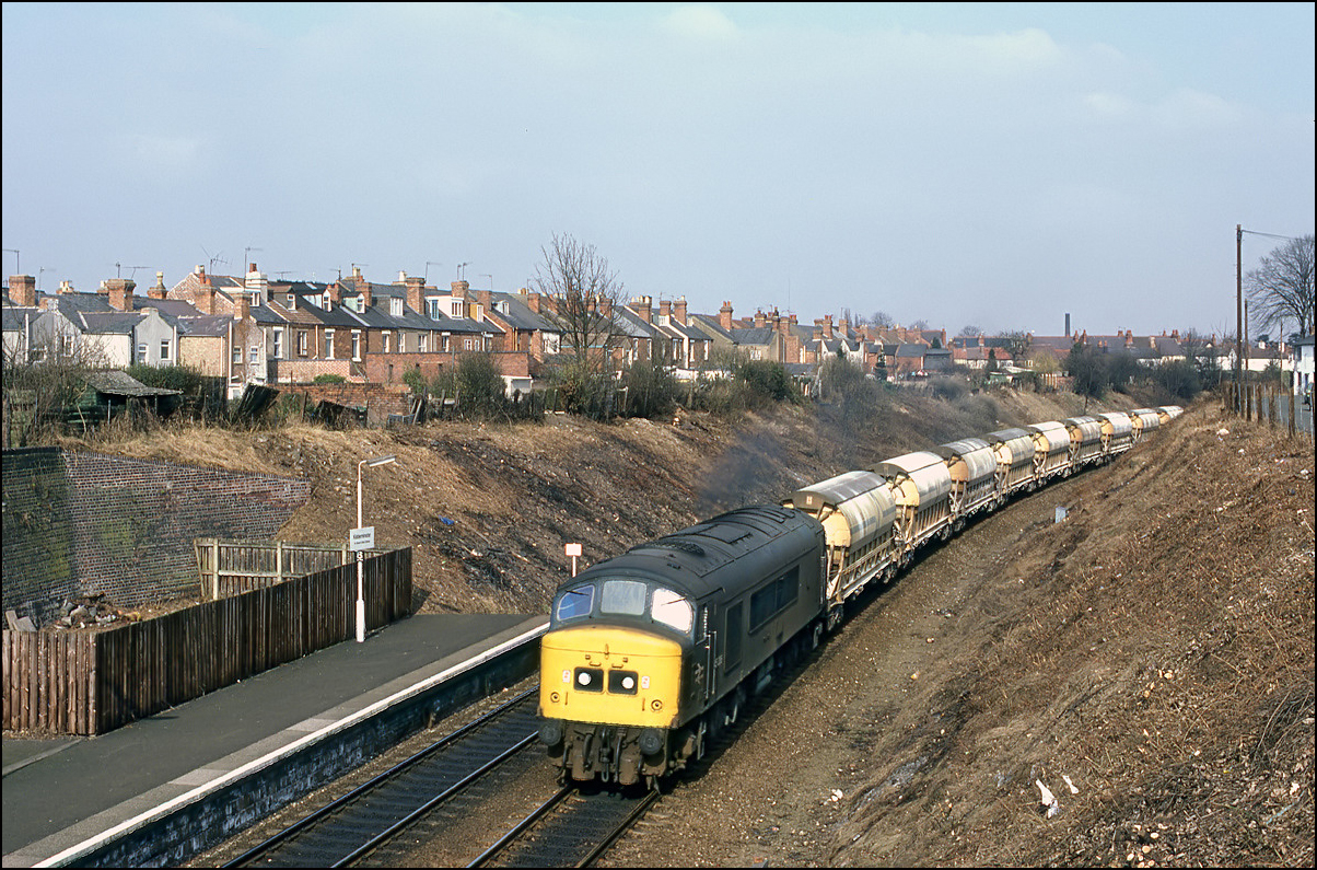 After a move from the Finedon Road bridge to the station at Wellingborough on 25 April 1986 I went to the end of the platform to take this shot of 45113 going south with a ballast train which had presumably originated