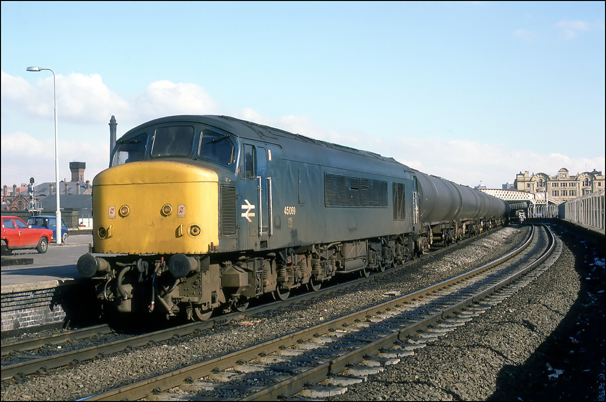 The second class 45 image taken on 27 February 1986 involved me in some quite uncharacteristic bravado. 45069 appeared from the east on a long train of oil tankers heading for Weaste - probably 6M16 04.20 from Lindsey. It was stopped at the signal