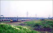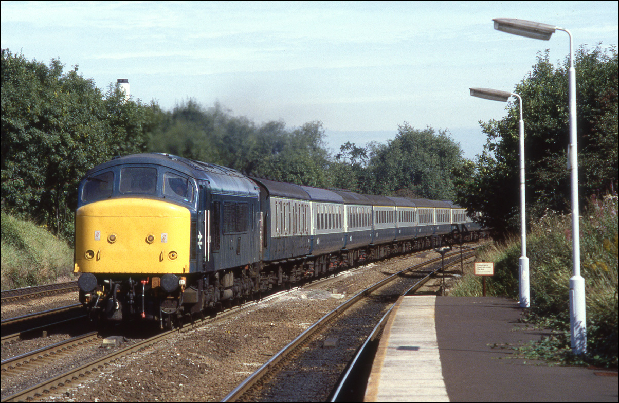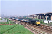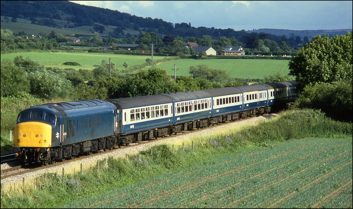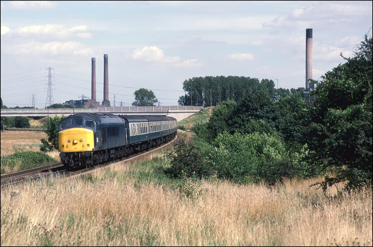 On the other side of the M42 some decent shots were possible from the field adjacent to the line. This one shows 45150 with a Newcastle to Poole train on 19 August 1987. The Peak would almost certainly have been replaced by a class 47 at Birmingham New Street.