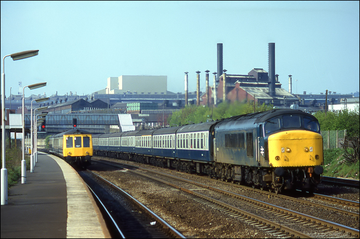 would now be a class 321 electric unit and the express a Voyager or other unit and, not the least, the complete disappearance of the motor works. This picture was taken on Saturday 11 May 1985.