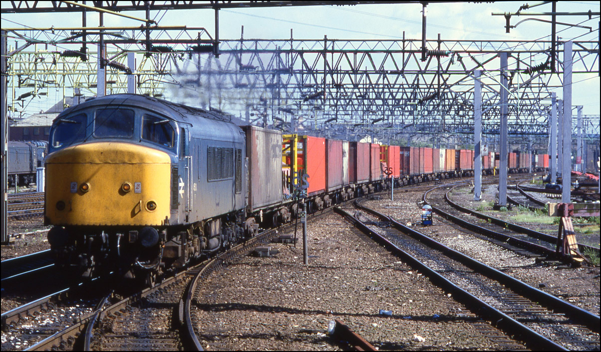 This photograph shows 45131 on a northbound freightliner service, the 4D58 1440 Lawley St-Holyhead approaching Stafford station on 14 June 1985. Although this service was regularly