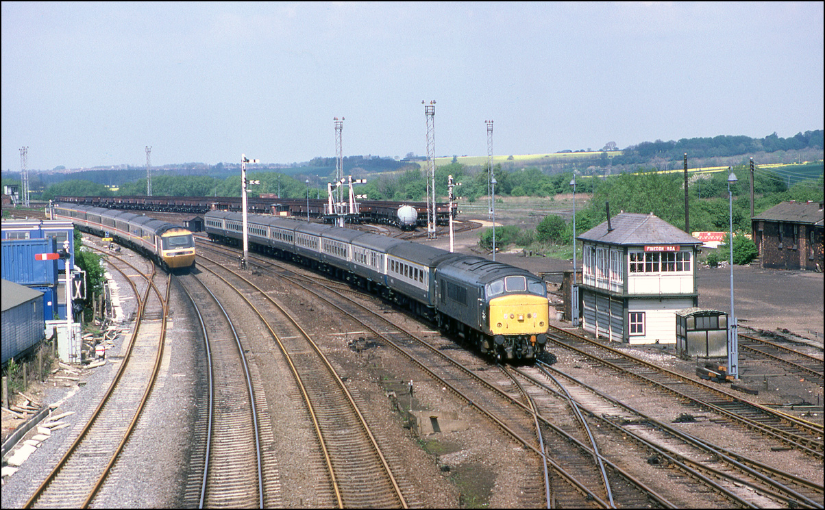 This picture is from 4 May 1987 at which time several parts of the Midland Main Line still had semaphore signalling. It shows 45132 passing Finedon Road yard at Wellingborough with an up ECS train as a down HST accelerates away in the opposite direction. The up main line was subject to engineering work north of this point at the time