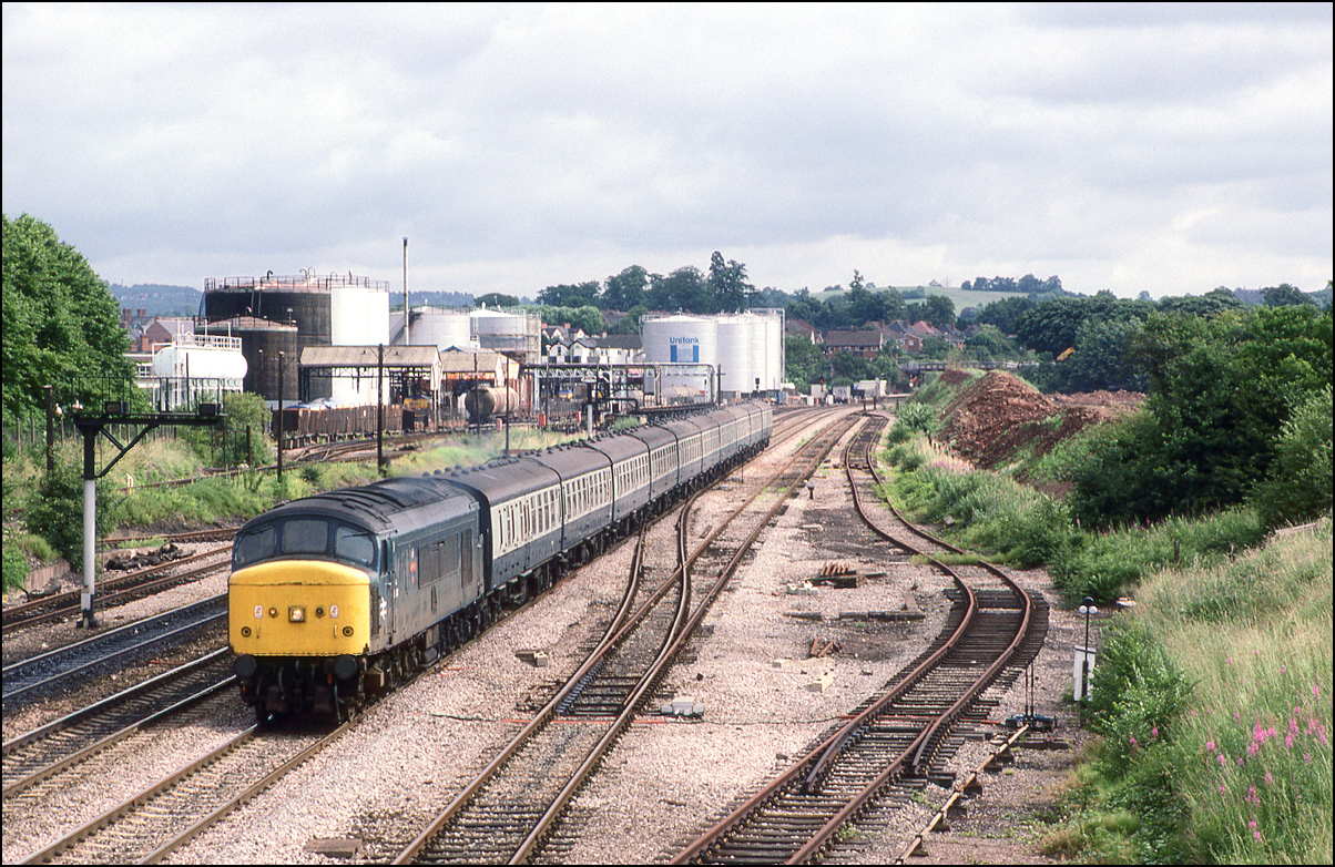 The first bridge south of Bromsgrove station is the location for the next picture which shows 45141 with the 07.05 Derby to Paignton on 7 July 1988. The rail-served oil tanks in the background added something to the scene but along with much other railway-related architecture have now gone