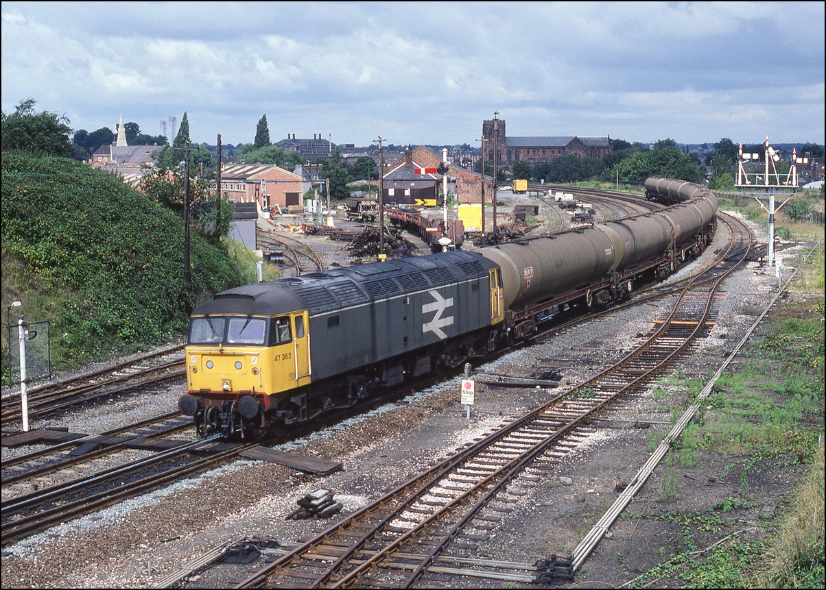 An unknown working of empty oil tanks behind 47362 passing Sutton Bridge Junction at Shrewsbury on 27 August 1986.