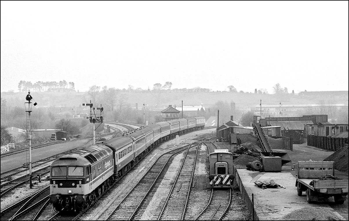 A misty morning at Droitwich Spa on 16 April 1987 saw inter-regional expresses diverted from the Oxford line to run via Worcester and the North Cotwold Line.