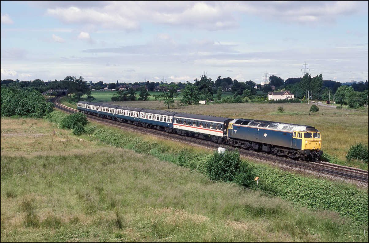 A Saturday morning Bristol to Leeds express hauled by 47566 at Water Orton on 9 July 1988. The embankment of the relatively new M42 was a good spot for