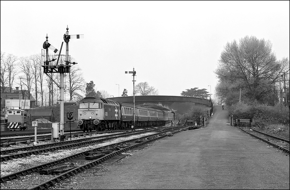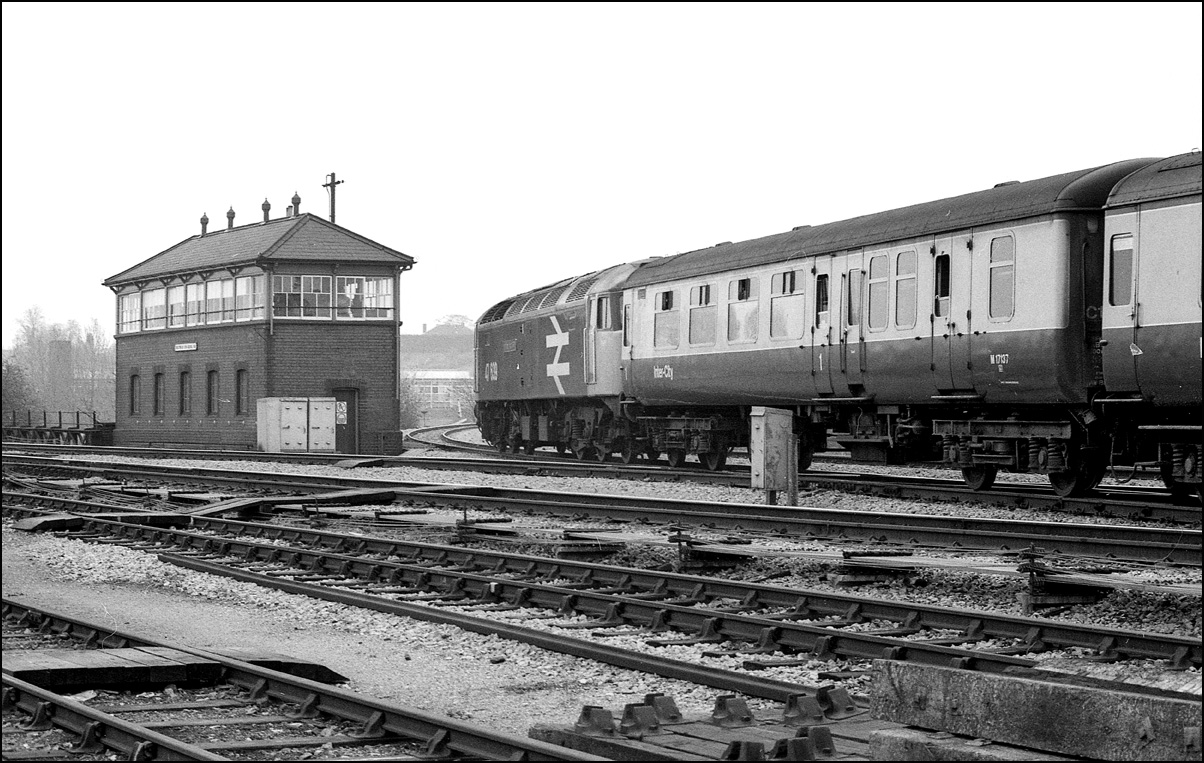 This was such a commonplace and everyday scene on 1984 that I don't think many people bothered to take photographs like this. It shows 47606 Odin, complete with WR nameplate, leaving Leamington Spa on 8 December 1984 with the 09.58 Manchester Piccadilly to Brighton service, which was running 20 minutes late