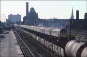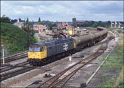 47314 passing Knighton Junction, Leicester with a long rake of oil tanks. All the interesting railway infrastructure disappeared in the Leicester area resignalling project. Time has lent a certain amount on enchantment to this dull everyday scene - it wouldn't have