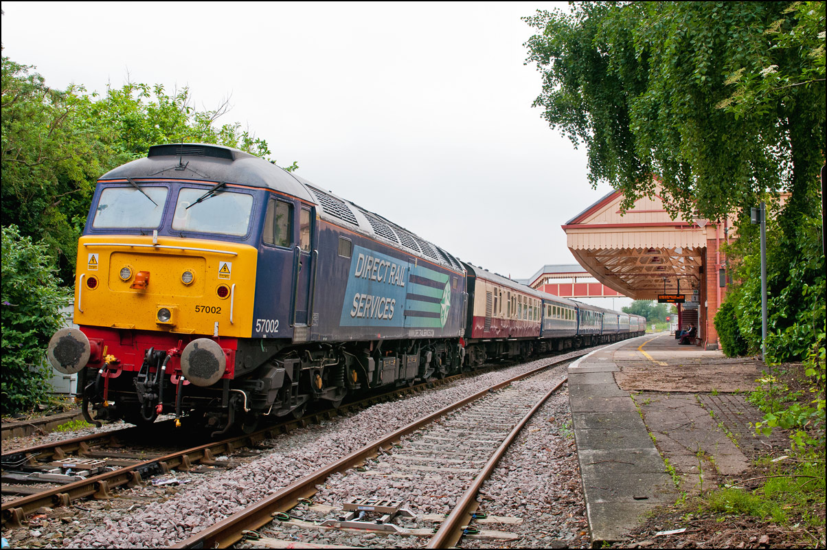 The railtour that ran from Stratford-upon-Avon to Carlisle on 7 July 2012 with 20309 + 20308 returned, after a locomotive change at Crewe, behind 57002. The stock stabled overnight