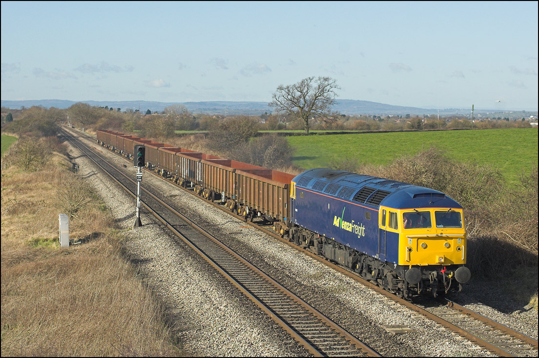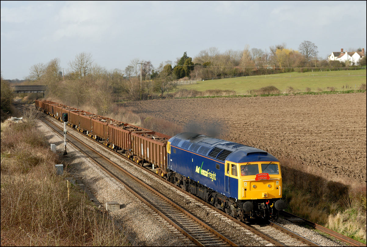day, I was pleased that I was able to go and take a few pictures. Here is the locomotive arriving at Long Marston as 0Z98 from Gloucester, complete with an "Advenza Freight" headboard.