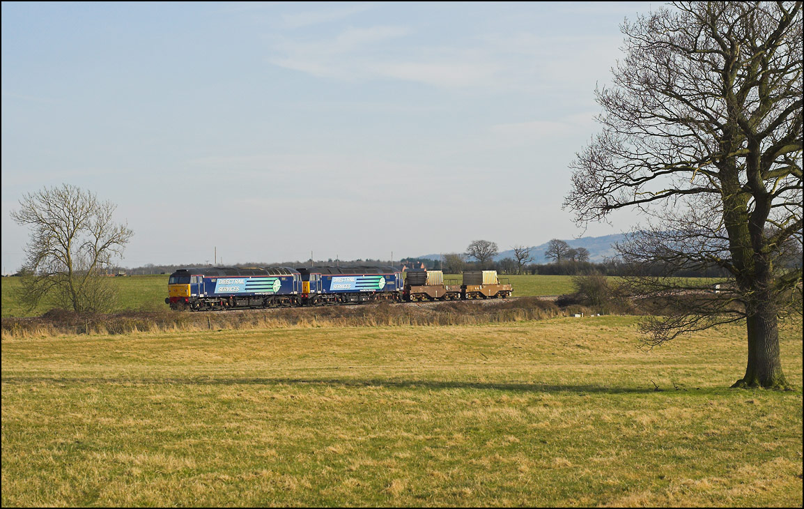 lucky locomotive was 57005. 6Z75 is here seen passing the site of Defford station, near Pershore in Worcestershire, in a patch of sun that came from nowhere in an otherwise stormy sky. The wagons are KEAs and in a previous life this one still with a Trans Manche Link roundel was used to transport Channel Tunnel lining segments around Kent. Much