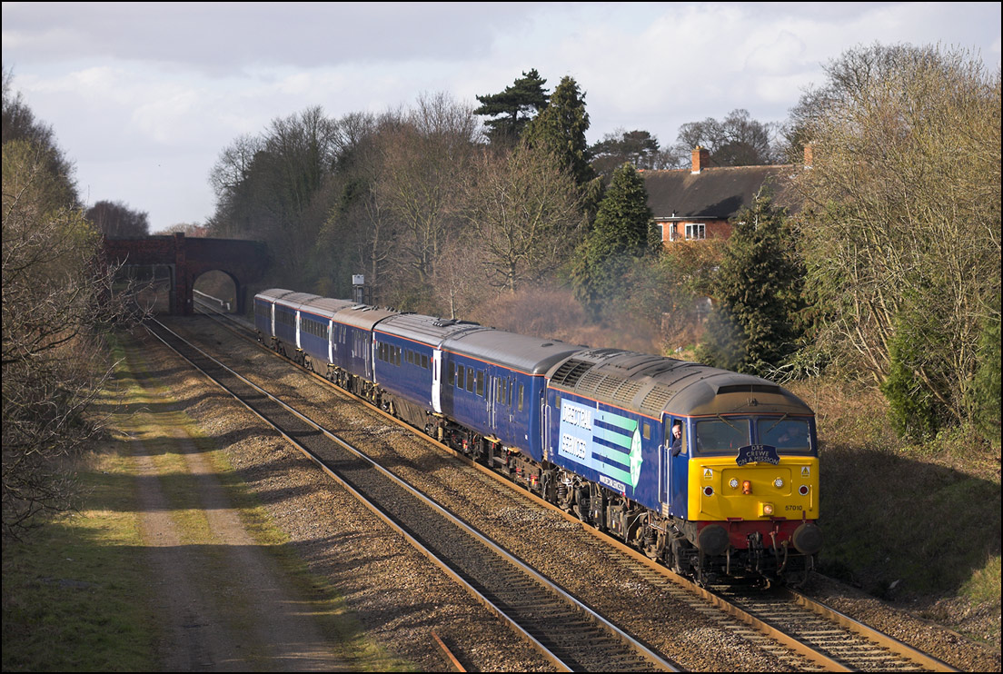 Not long after joining the branch, 57005 stopped for a few moments and this gave me plenty of time to make the run to Honeybourne to try for a shot as 6Z98 came around the curve onto the East Loop. The sun had faded a little but the light still was perfectly reasonable as the
