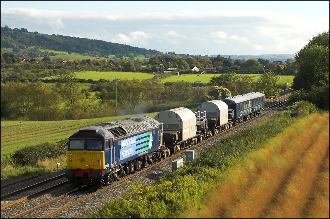 One of the irregular trains conveying naval nuclear material from Keyham, near Plymouth to Carlisle ran on Thursday 21 October 2010. The working, 6X50, was hauled by DRS's 57010 and consisted of two large nuclear flasks and two escort coaches and is here seen passing a colourful field